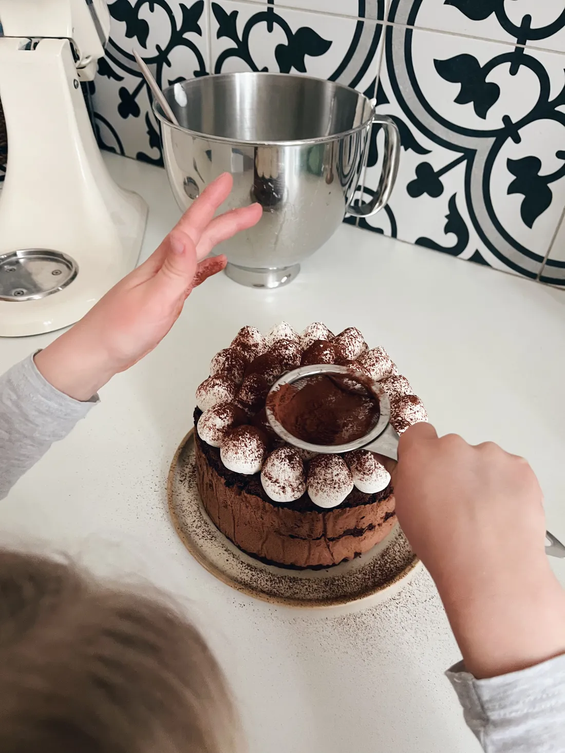 Doma mi dcera pomáhala zdobit dort, který jsme v neděli upekly a o kterém mluvila celou cestu ze školky. Ušlehaly jsme šlehačku, ozdobily dort pusinkami a dcerka sypala kakao. Chtěla jsem jí pomoc, aby byl dort posypaný rovnoměrněji, ale odmítla.