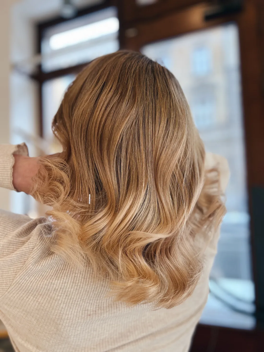 Finálním krokem byl jemně nazlátlý přeliv, vyfoukání a vlnky. Krásná práce, odcházela jsem moc spokojená.