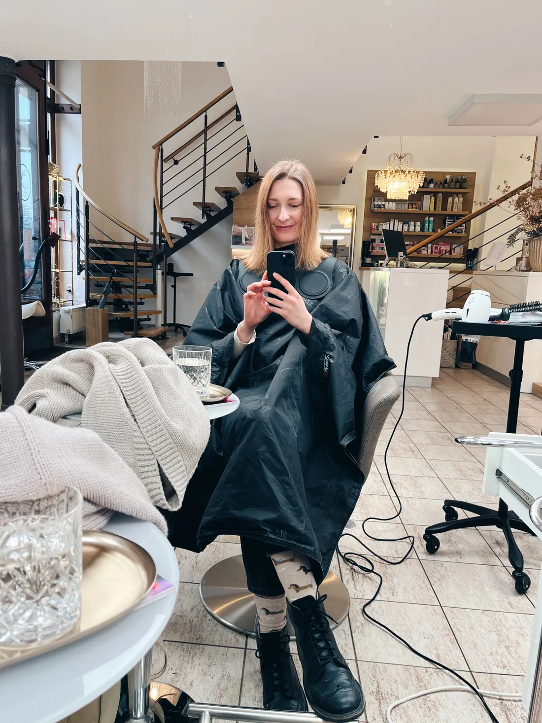 Nejdřív přišlo na řadu čistění vlasů pomocí metody Malibu C, která z vlasů vytáhne silikony a další nečistoty, které se na vlasech usadily. Dalších 40 minut jsem seděla v křesle, zatímco kolem mě kroužil jakýsi přístroj, který vlasy zahříval. Vzala jsem s sebou pletení, aby mi to ubíhalo.
