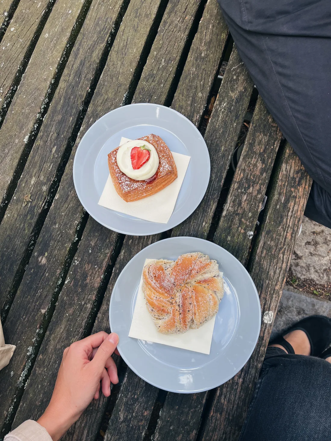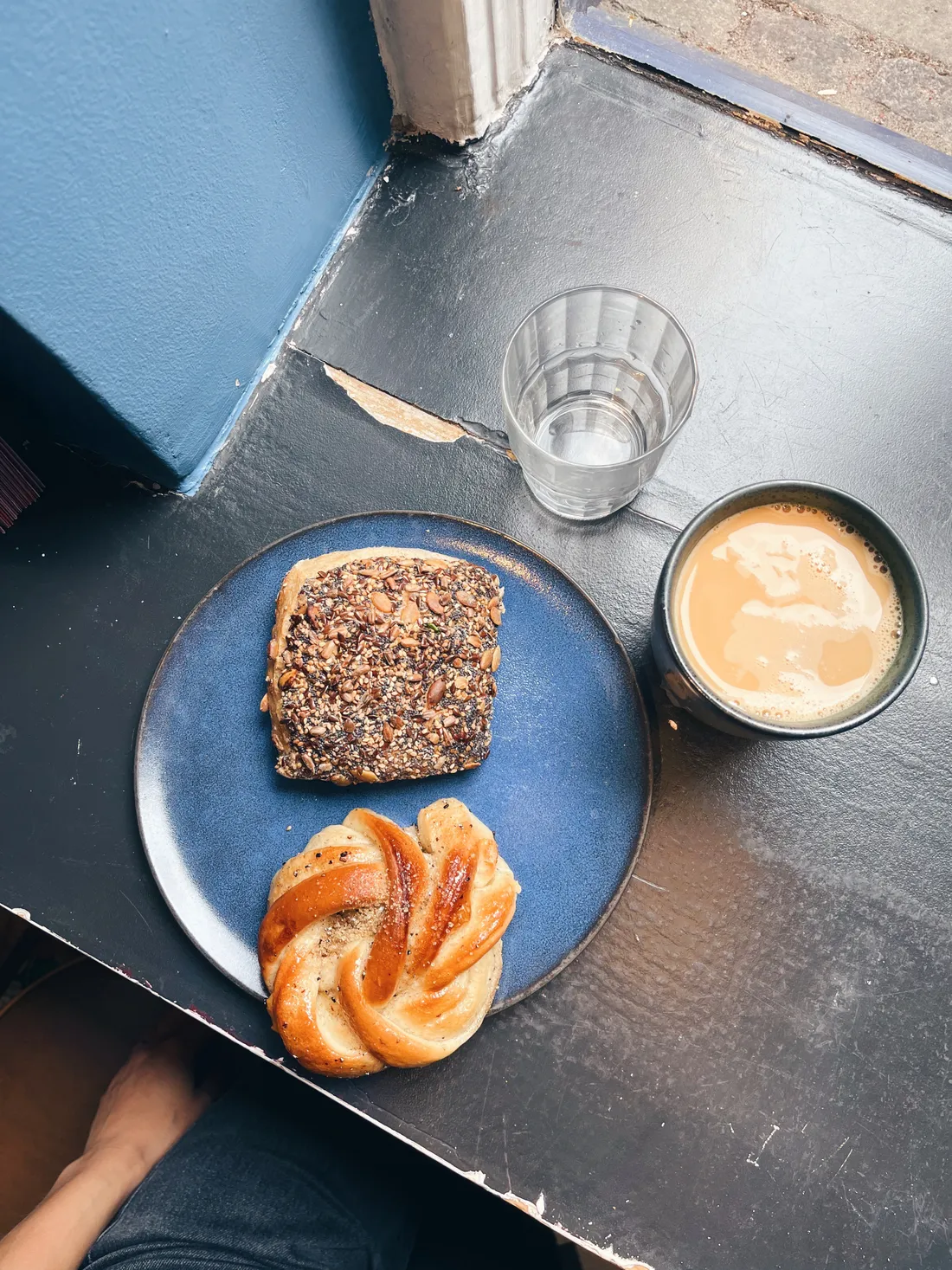 Já jsem si dala vybrala kváskovou housku, šneka s kardamomem a kafe.