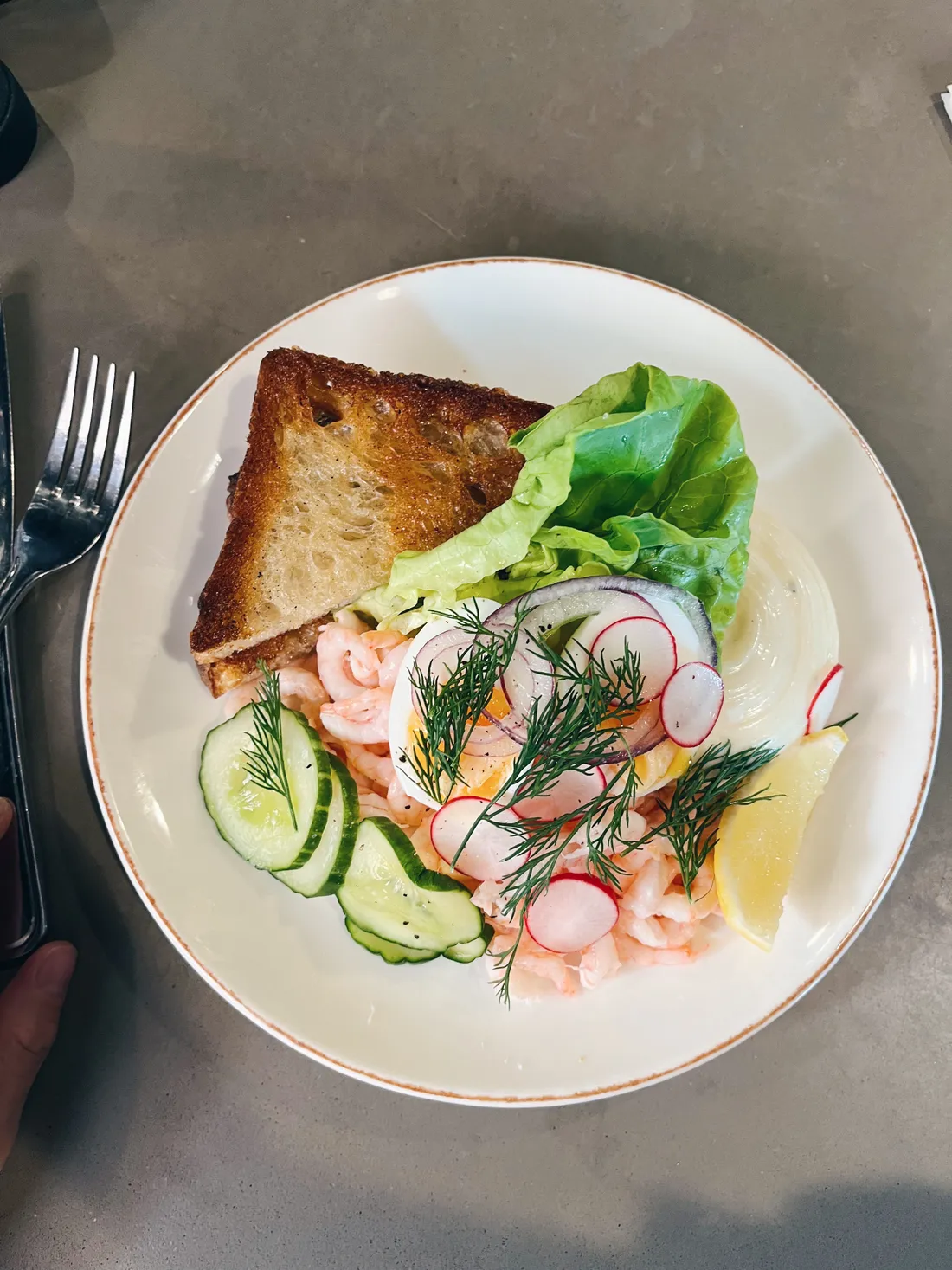 Když Jakub dorazil, šli jsme na jídlo. Vybrala jsem si räksmörgås, krevetový toust. Byl moc dobrý, jen mě zarazila ta hromada majonézy.