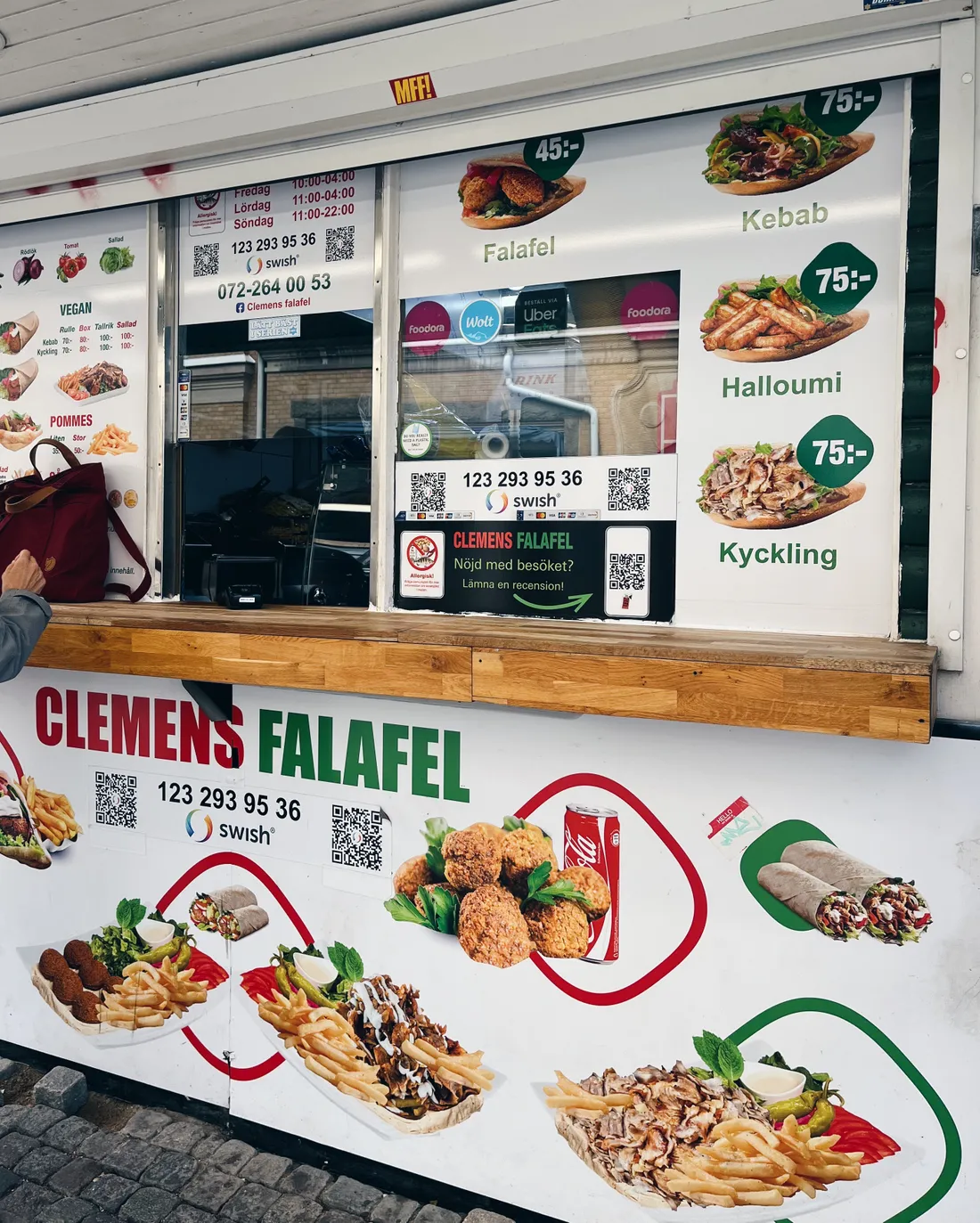 Už bylo kolem oběda, nad námi se stahovala hrozivě vypadající mračna a na poslední chvíli jsme poobědvali falafel, kterým je místní okolí vyhlášené. I když stánek nevypadal kdovíjak lákavě, falafel byl moc dobrý. Pak už jsme sedli jsme na zpáteční vlak do Malmö, zatímco venku zase pršelo.