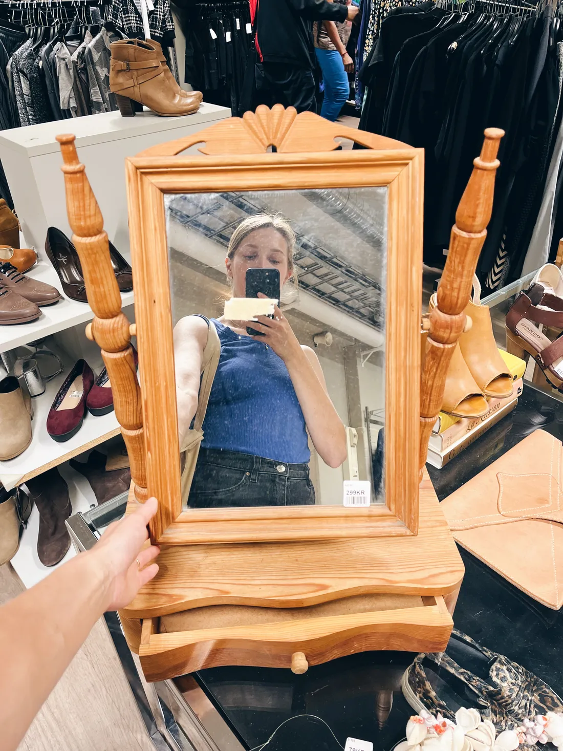 Můj muž jel na byt, mně se ale zatím zpátky nechtělo. Řekla jsem si, že se podívám ještě do pár sekáčů. Tohle zrcadlo mi padlo do oka, ale (hádáte správně) nevešlo by se nám do tašky v letadle. Je to obchod Myrorna (v překladu mravenci).