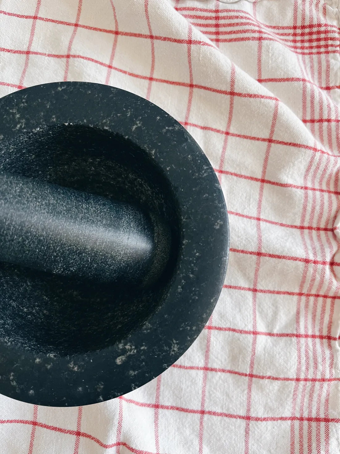A nakonec hmoždíř. Na drcení koření, bazalkového pesta nebo třeba sušených čípků na čaj. Můj je z žuly, je pořádně těžký.