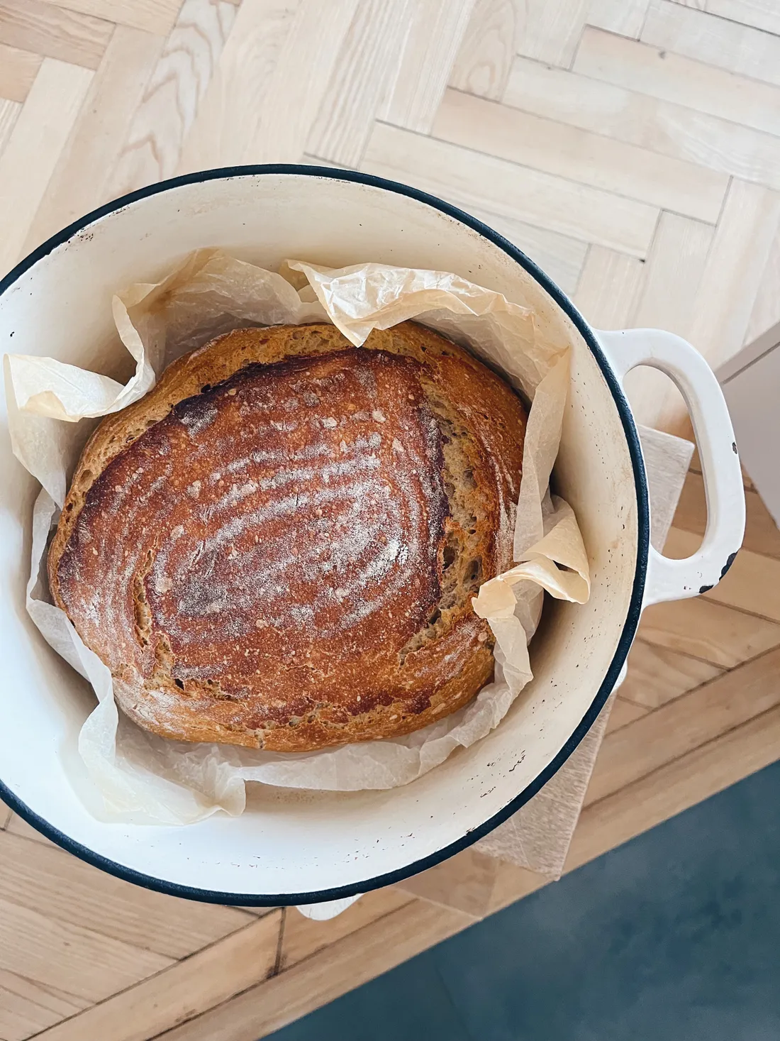 Někdy raději upeču chleba ve tvaru bochníku. Aby dobře vyskočil, buď nahřeju v troubě plech nebo ho dávám do rozehřátého litinového hrnce se smaltovaným povrchem, mám ho zase od Fabini. Koupila jsem ho hned loni (nebo už to je dva roky zpátky?), když ho začínali vyrábět.