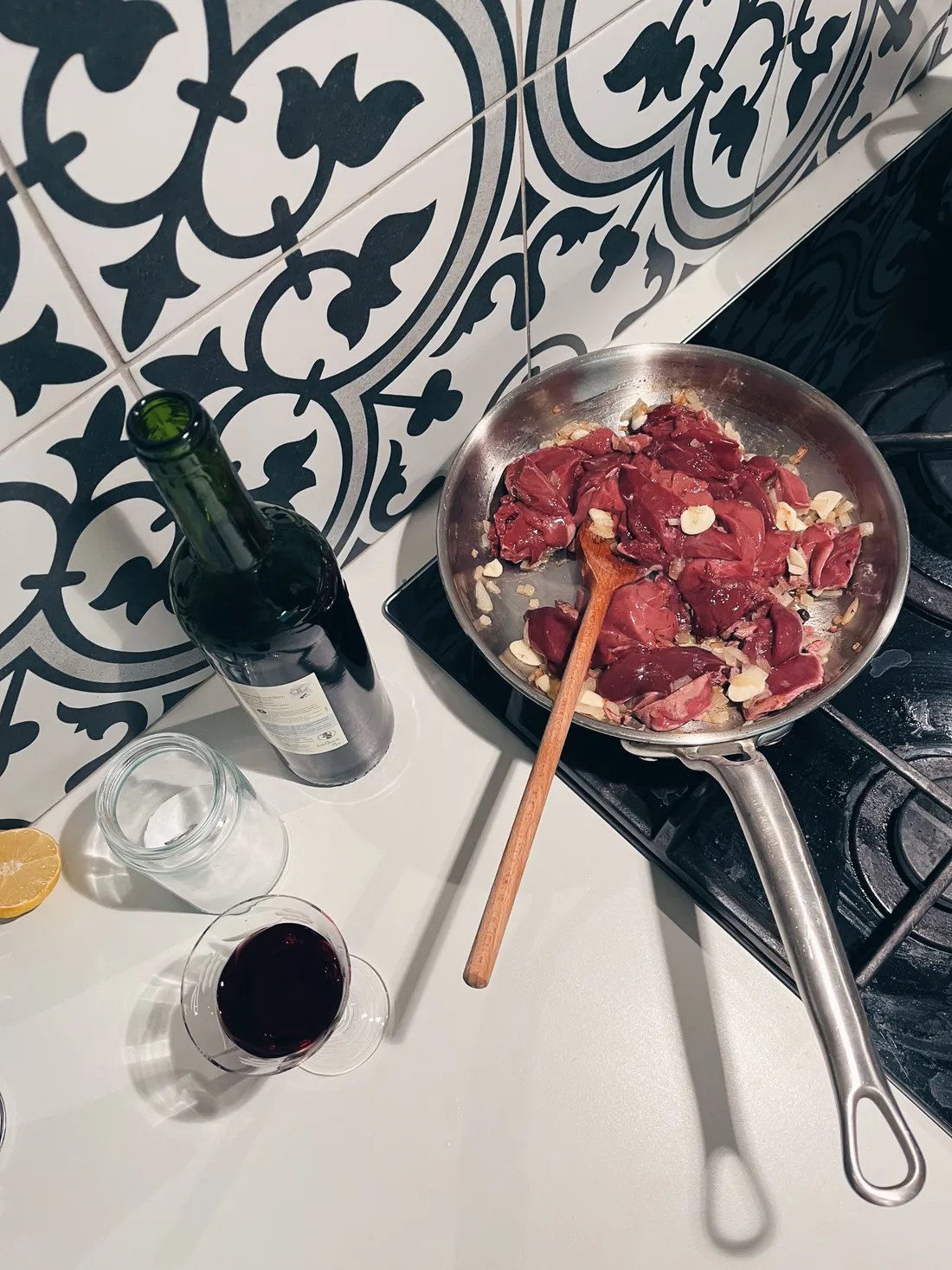 Dělám na ní i základ paštiky. Dozlatova opeču cibulku, přidám krůtí játra, bobkový list, sůl, pepř a opeču. Pak přileju skleničku červeného vína, nechám odpařit a vypnu plotýnku. Až směs vychladne, rozmixuji játra se smetanou a máslem v mixéru na smoothie, přeliju do krabičky a nechám ztuhnout v lednici.