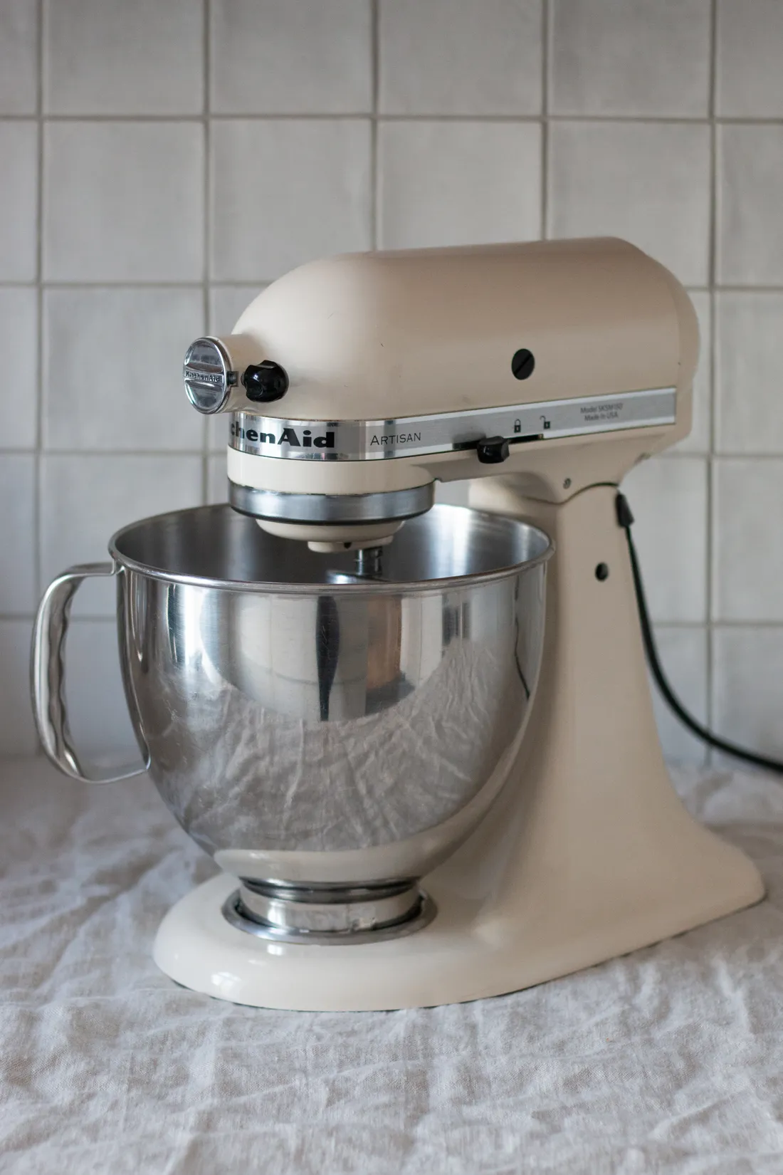 Mým dalším kuchyňským pomocníkem je KitchenAid Artisan. Koupila jsem ho před 10 lety do své cukrářské provozovny, kde jsem dva roky pekla svatební dorty a koláče pro kavárny. Používám ho průměrně 2x týdně a pořád funguje, po všech těch letech. Umíchá těsto na chleba, koláče, dorty, všechny krémy a nikdy se nepřehřeje. Vím, že to větší investice do kuchyně, ale podle mě se vyplatí, pokud hodně pečete.