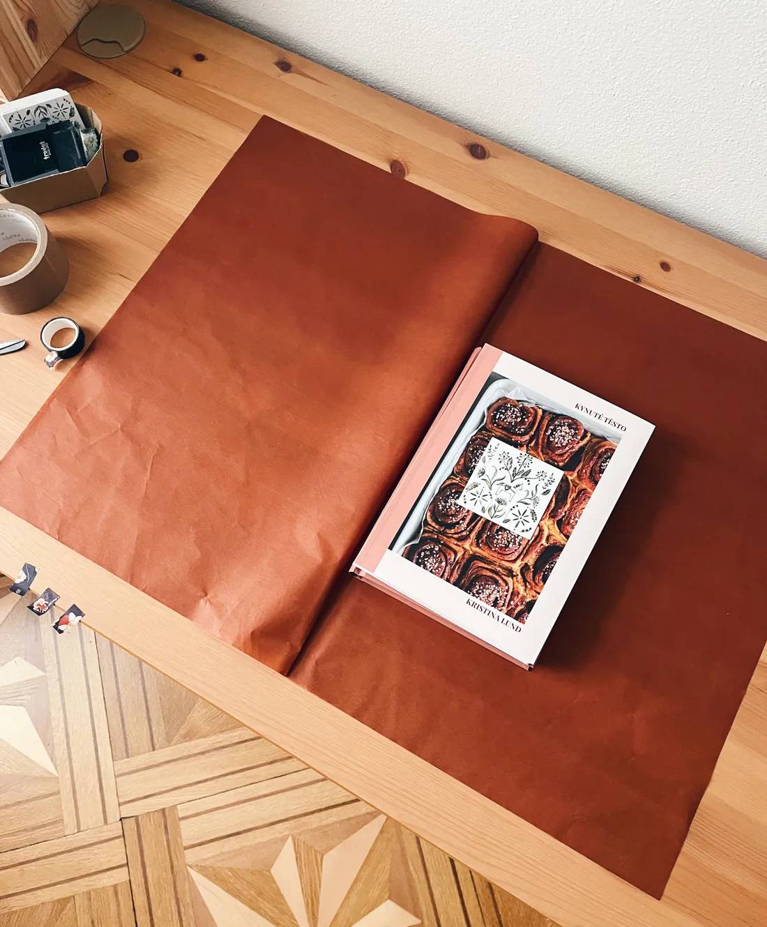 Balila jsem pár objednávek kuchařek, co přišly během dne. Každou knížku podepíšu, přidám kartičku s poděkováním a zabalím do hedvábného papíru. Chci, aby vaše objednávky byly hezké na pohled.