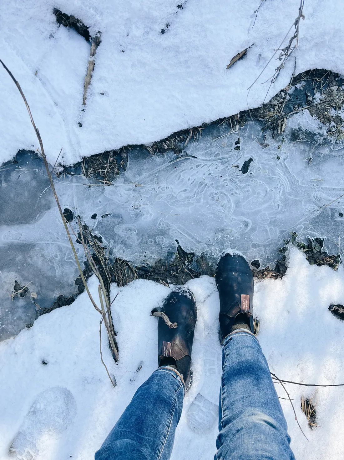 Potůček byl zamrzlý, ale stejně se pode mnou probořil a já se propadla do bahnité vody. Naštěstí Blundstones to ustály a moje nohy zůstaly suché.