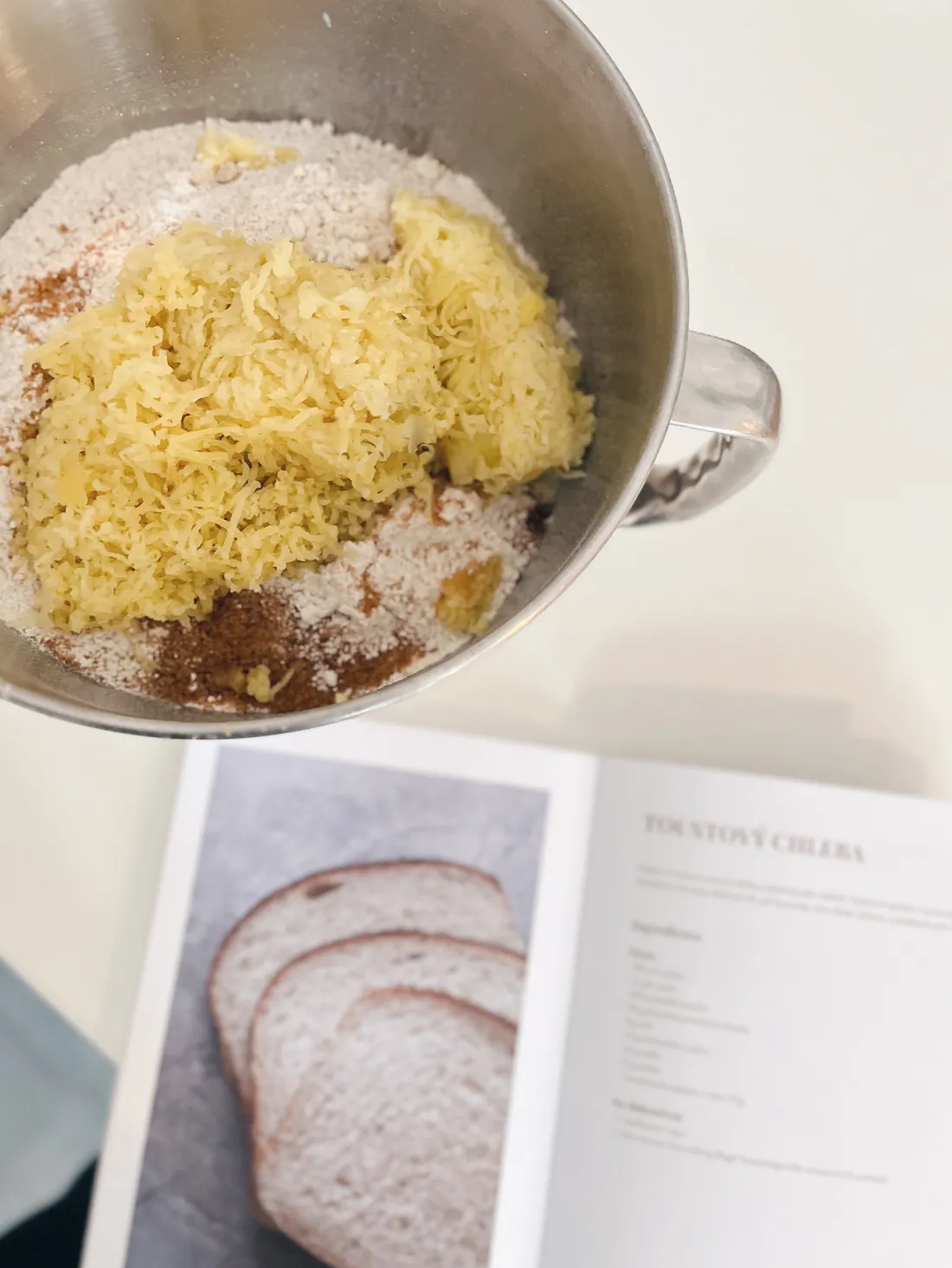 V neděli jel manžel s dětmi ven a já jsem strávila nějaký čas v kuchyni. Zadělala jsem těsto na tousťák podle kuchařky Kynuté. Je v něm nastrouhaná uvařená brambora, která mu dodá vláčnost.