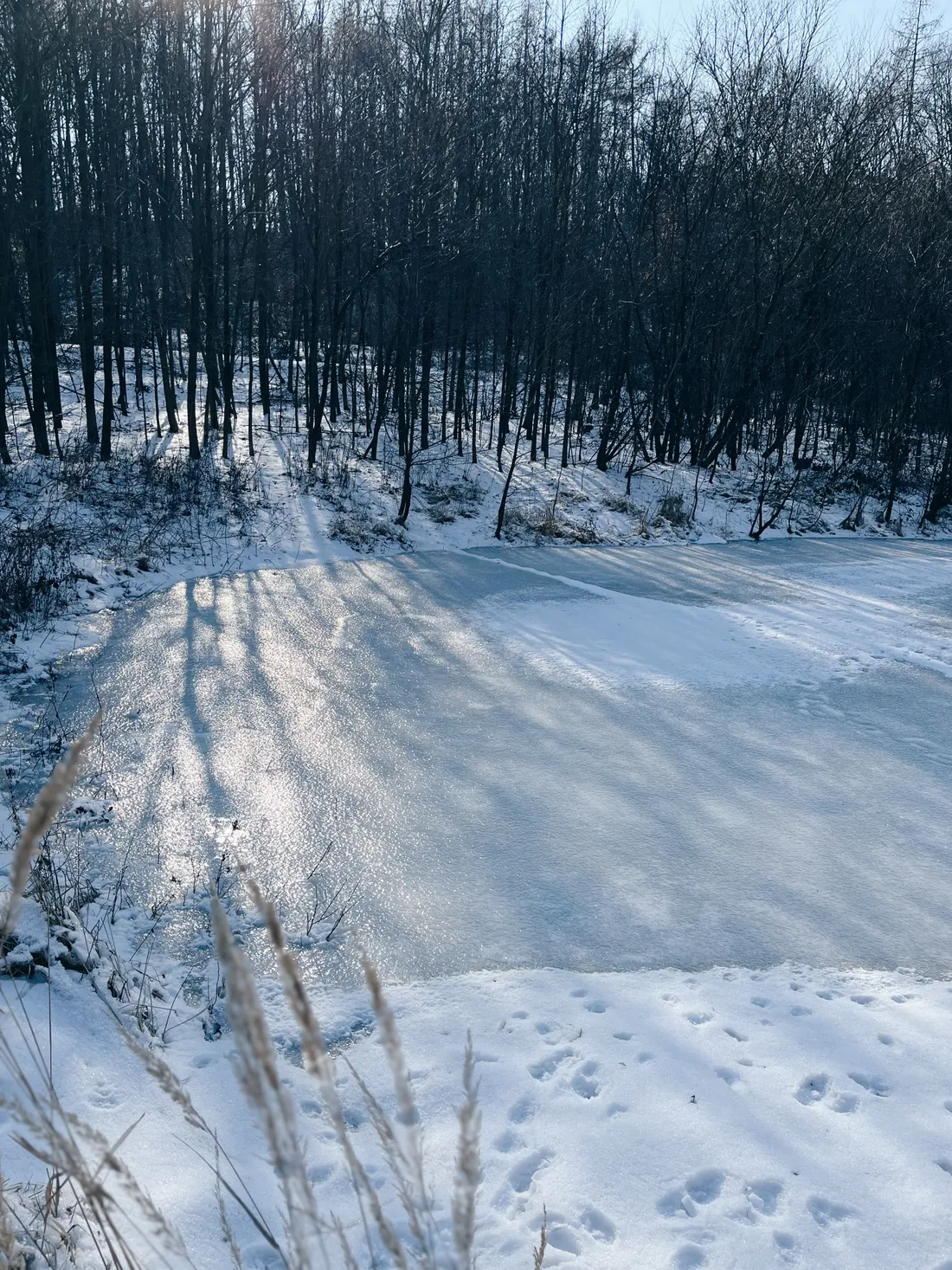 Na chvíli jsem se šla projít do lesa a po cestě zpátky jsem objevila zamrzlý rybníček. To bylo radosti a klouzání!