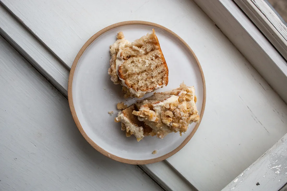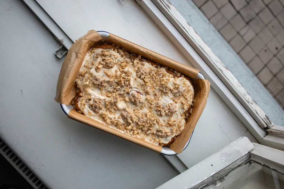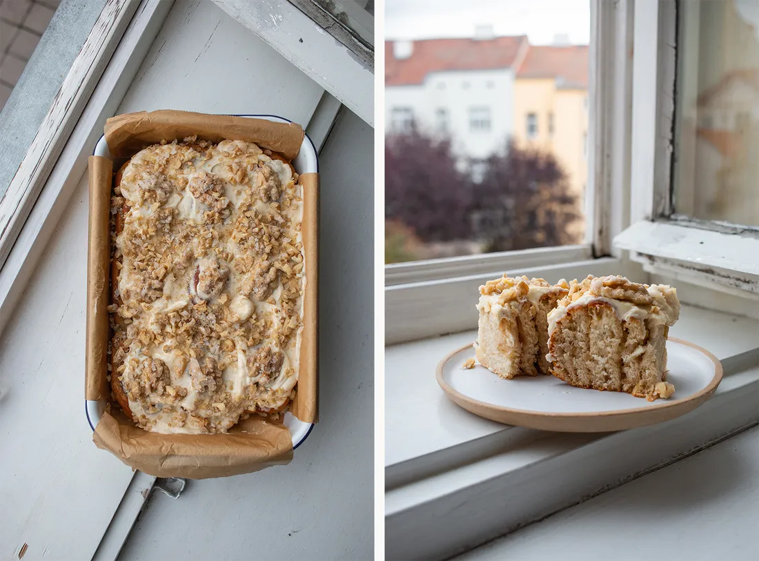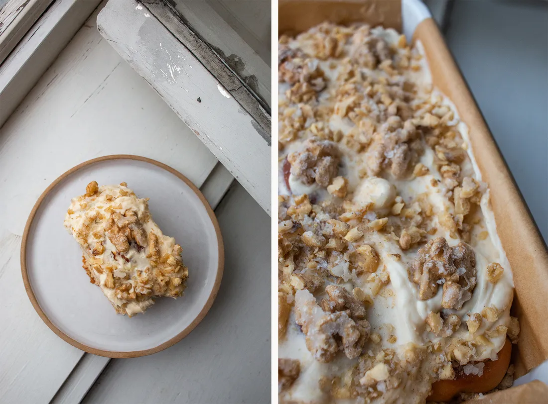 Ořechoví šneci s kardamomem, polevou z krémového sýra s javorovým sirupem a vlašáky v cukrové krustě