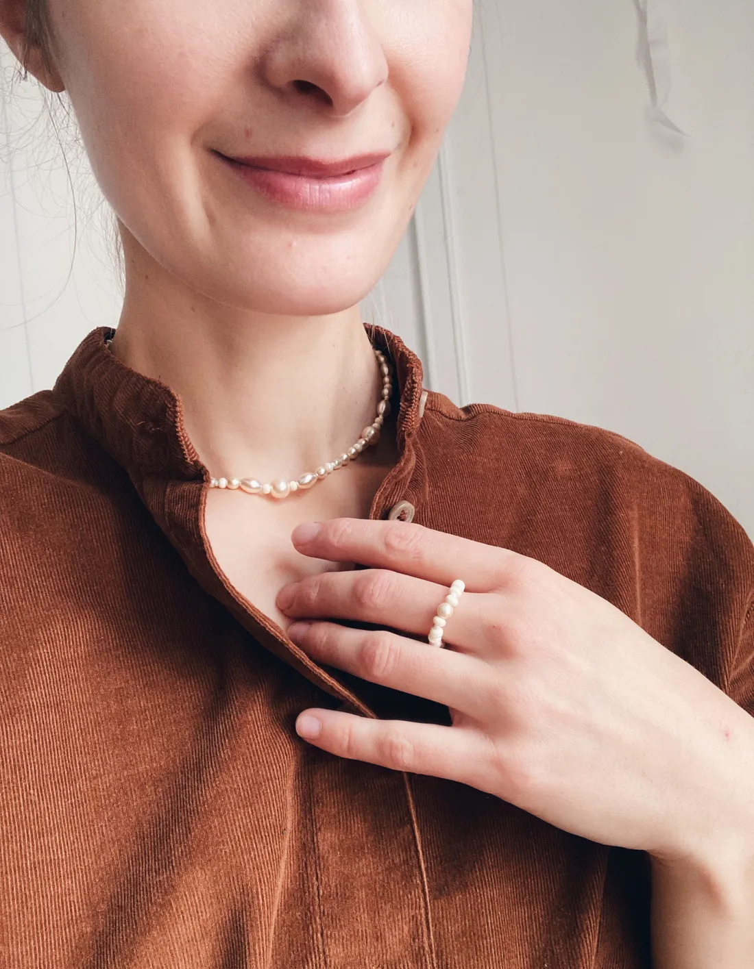 Dokončila jsem perličkový náhrdelník a udělala jsem si k němu jednoduchý prstýnek z drátku, s výsledkem jsem moc spokojená.