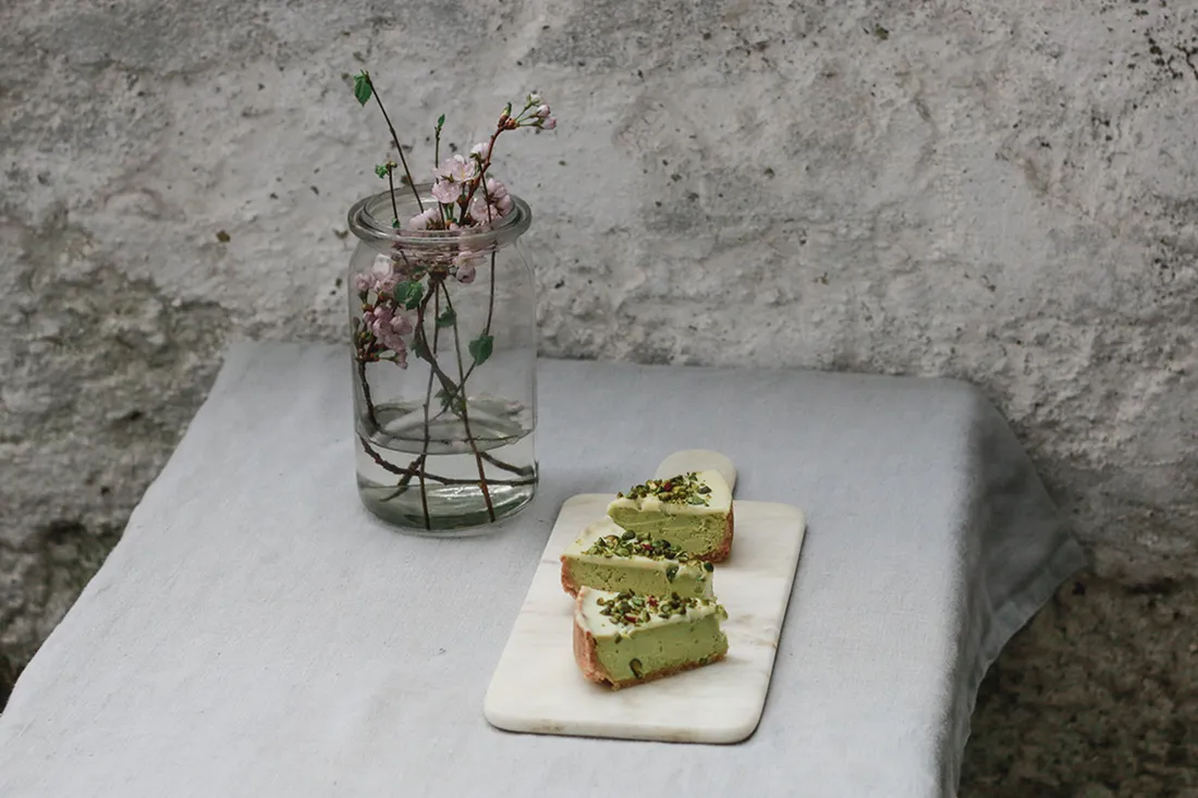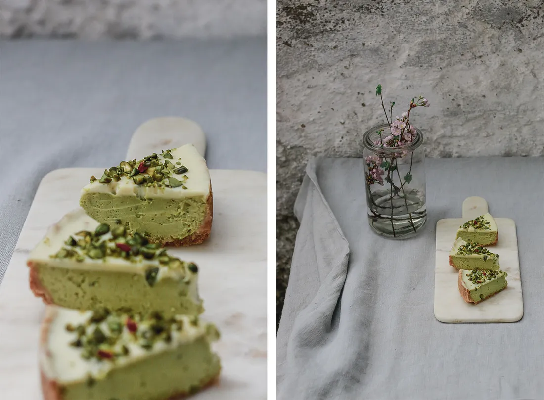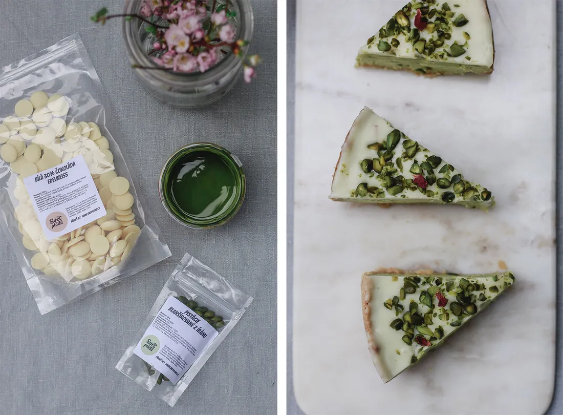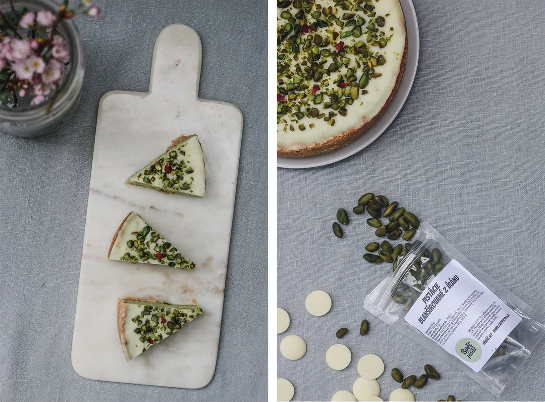 Pistáciovou chuť dodá cheesecaku pistáciová pasta, v tomto receptu používám tu od značky Lepé. Můžete použít jakoukoli jinou pistáciovou pastu nebo máslo, ale je důležité, aby byla udělaná jen ze 100 % mletých pistácií. Umělé chutě a barviva nechceme. Podle druhu použitých pistácií a způsobu mletí se barva i struktura pasty/másla může měnit. Nicméně chuť bude velmi podobná.