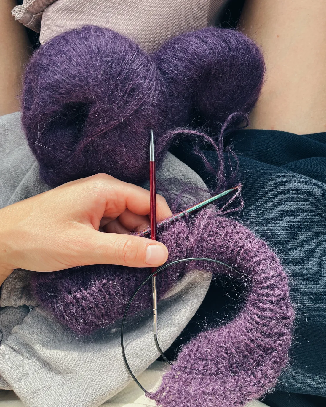 Cesta domů. Zase jsme se sbalili večer předem, vstali v půl čtvrté a naložili polospící děti a jeli jsme. Po cestě jsem něco málo upletla, je to mohérový svetřík podle Petite Knit, ale mohér je teda velmi tenké vlákno, jde to pomalounku.