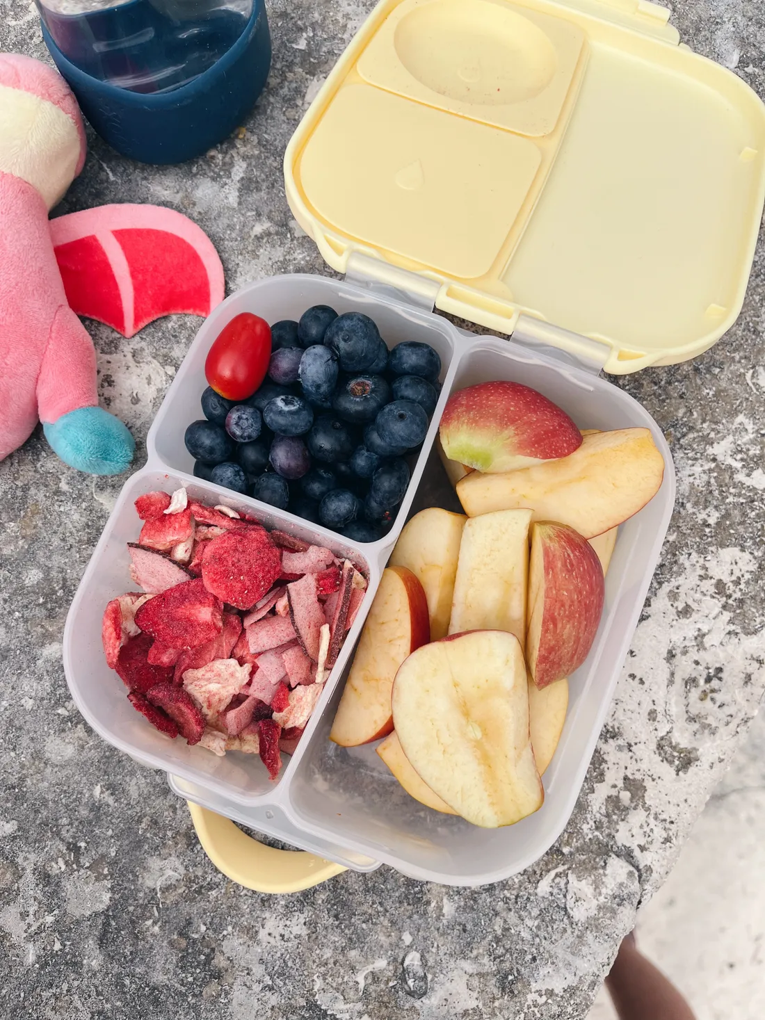 A nebyly by to naše děti, kdyby okamžitě nechtěly svačinku :) Syn má nový boxík na svačinu do školy, tento. A v něm ovoce a myx letního lyofilizovaného ovoce, mňam.