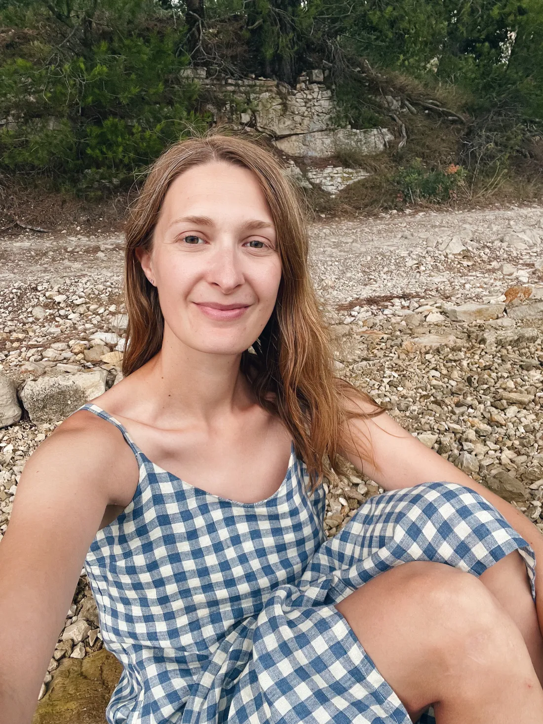 A tady já. Makeup a vlasy má na starost sluníčko a moře, šaty mám z Joli Joli. Modré kostičkované látce mám problém odolat.