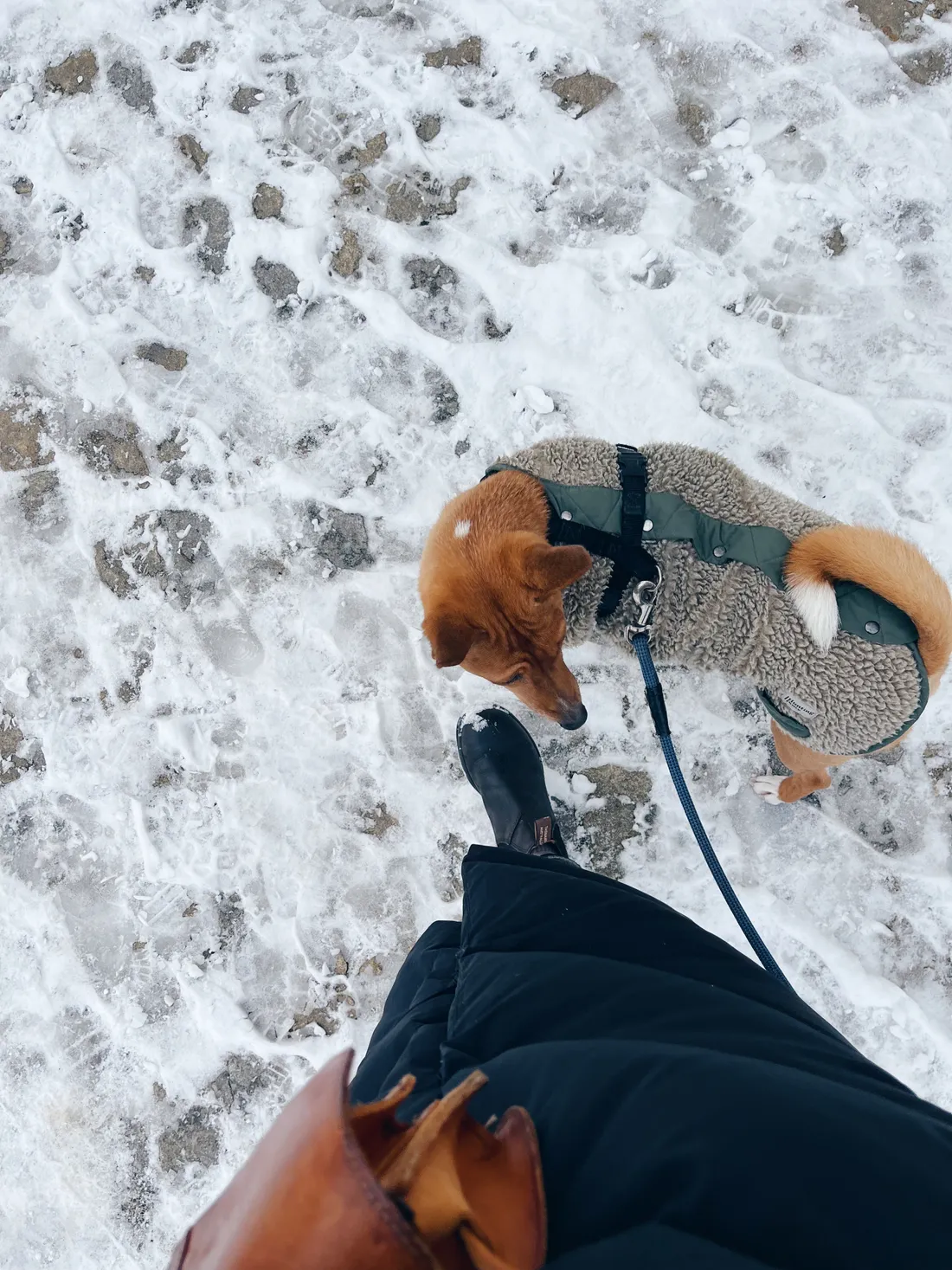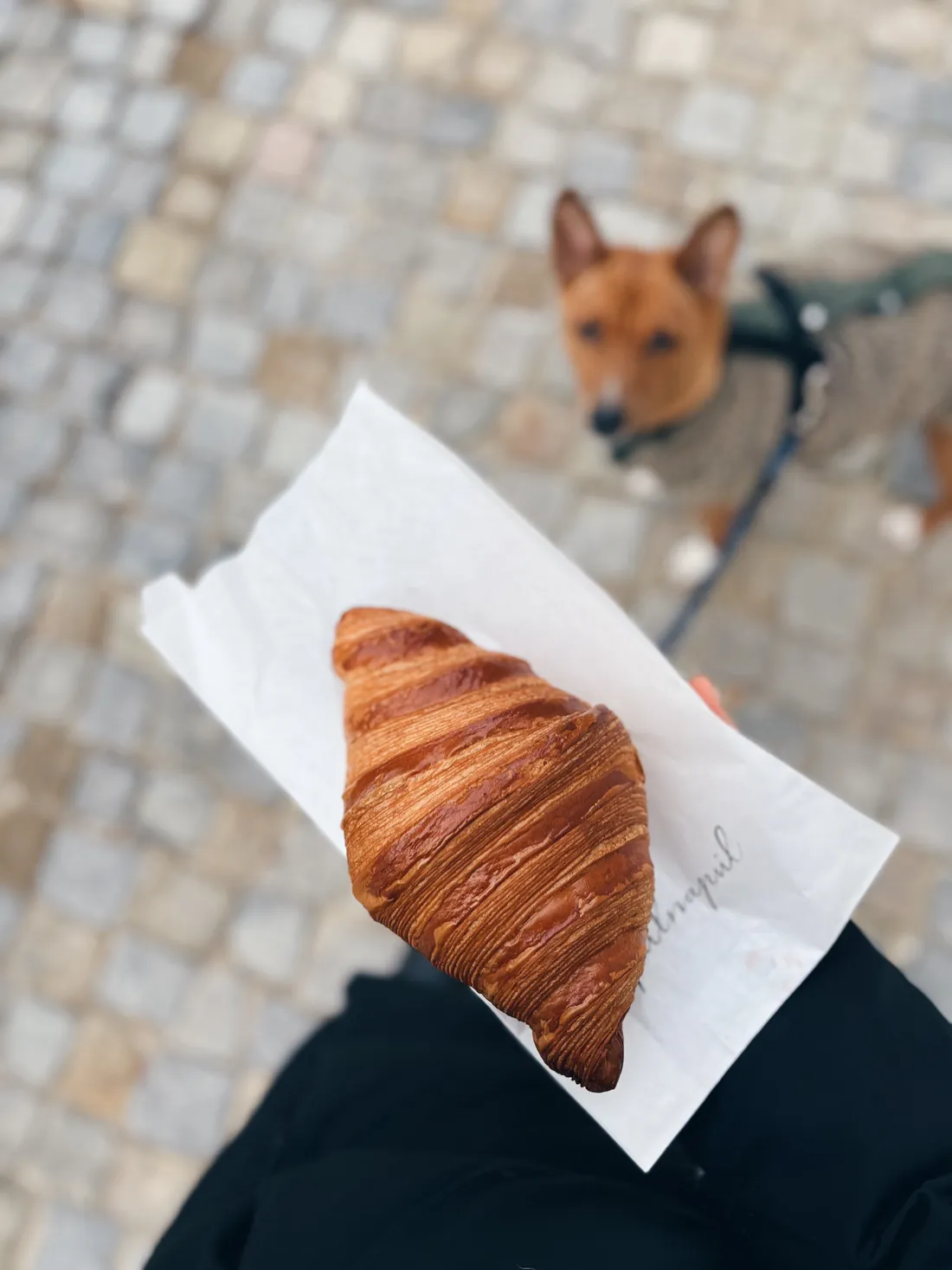 Pak na procházku s Čotym. Šla jsem kolem Půl na půl a protože jsem doma nesnídala, dostala jsem obrovskou chuť na jejich croissant. Řekněte mi, jak může být něco tak strašně moc dobré? Čoty by si taky dal, ale má smůlu.