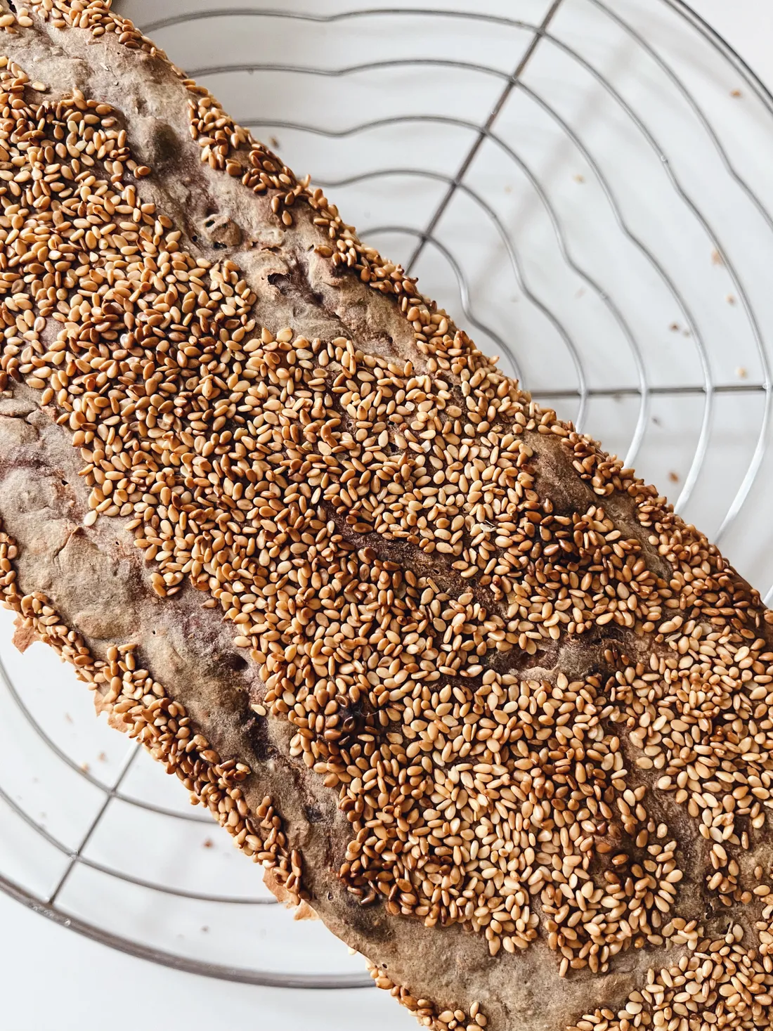 Když jsem se vrátila domů, nakrojila jsem čerstvě upečený kváskový chleba se sezamem.