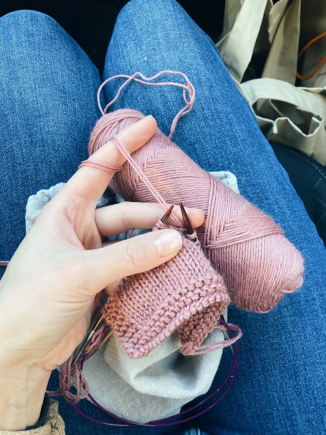 Na cestu jsem si vzala pletení. Chystám se na Oslo Hat, ale tady prozatím pletu vzorek, abych trefila správnou velikost čepice.