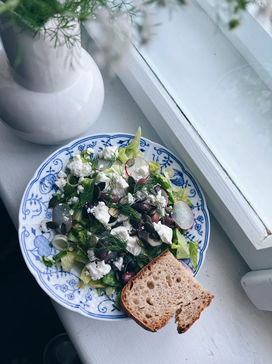 Večer jsem byla úplně přečokoládovaná a jediné, na co jsem měla chuť, byl křupavý salát. Je s jednoduchou zálivkou, s plátky ředkviček, fetou, černými olivami, opraženými dýňovými semínky a jarní cibulkou od mé paní sousedky. K tomu krajíček chleba.