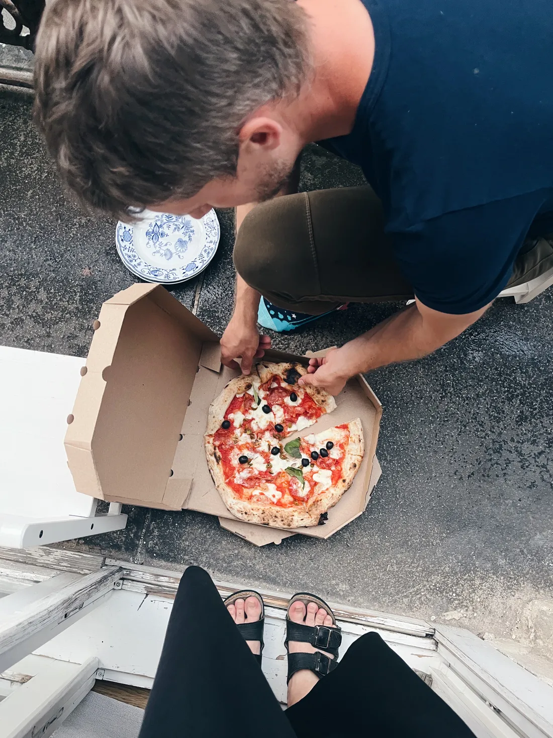 Večer jsme si objednali pizzu z Cantiny. Tohle je Diavola a byla skvělá. Snědli jsme si na balkoně.