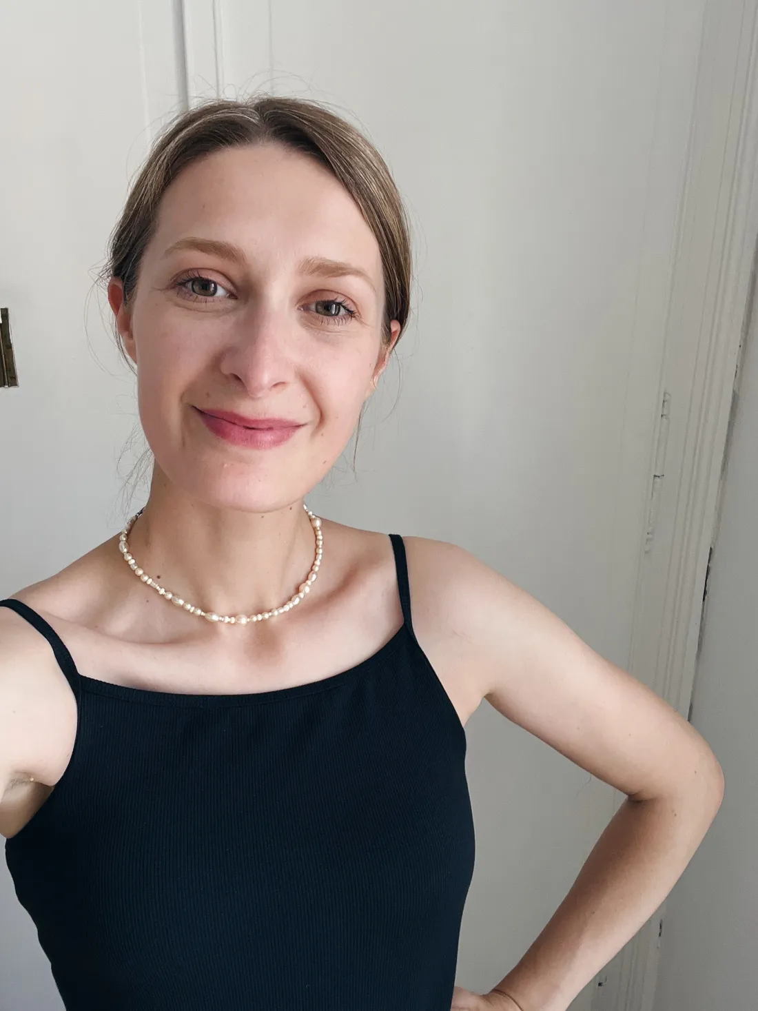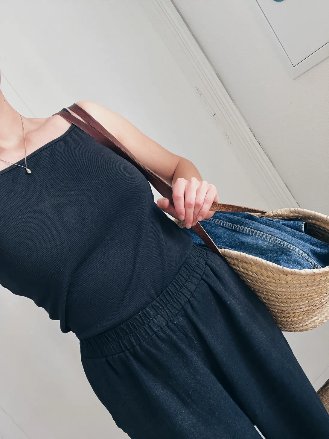 V pondělí jsem odvedla děti do školky a už po ránu bylo příjemně teplo. Na sobě mám své oblíbené tílko Uniqlo, které má lodičkový výstřih vepředu a hlubší výstřih vzadu. K němu lněné kalhoty z Lindexu a na krku zlatou kapičku od Elišky Lhotské.
