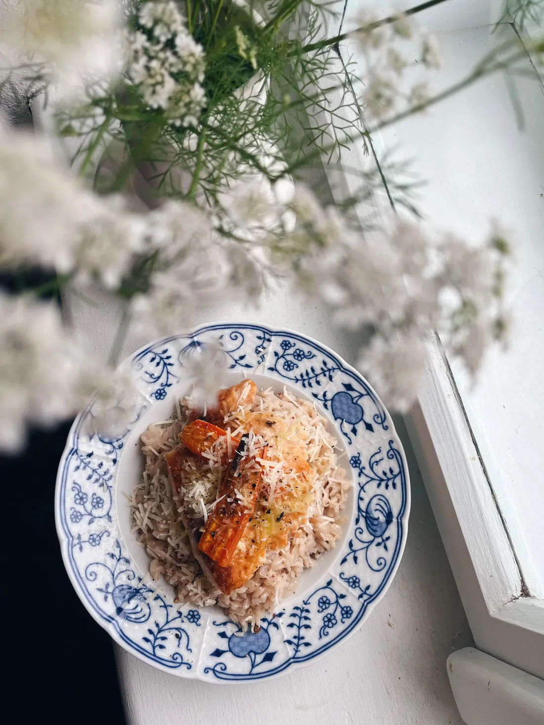 Tady je oběd, rizoto s pečeným lososem a pečenou mrkví. Moc povedené dílo mého muže.