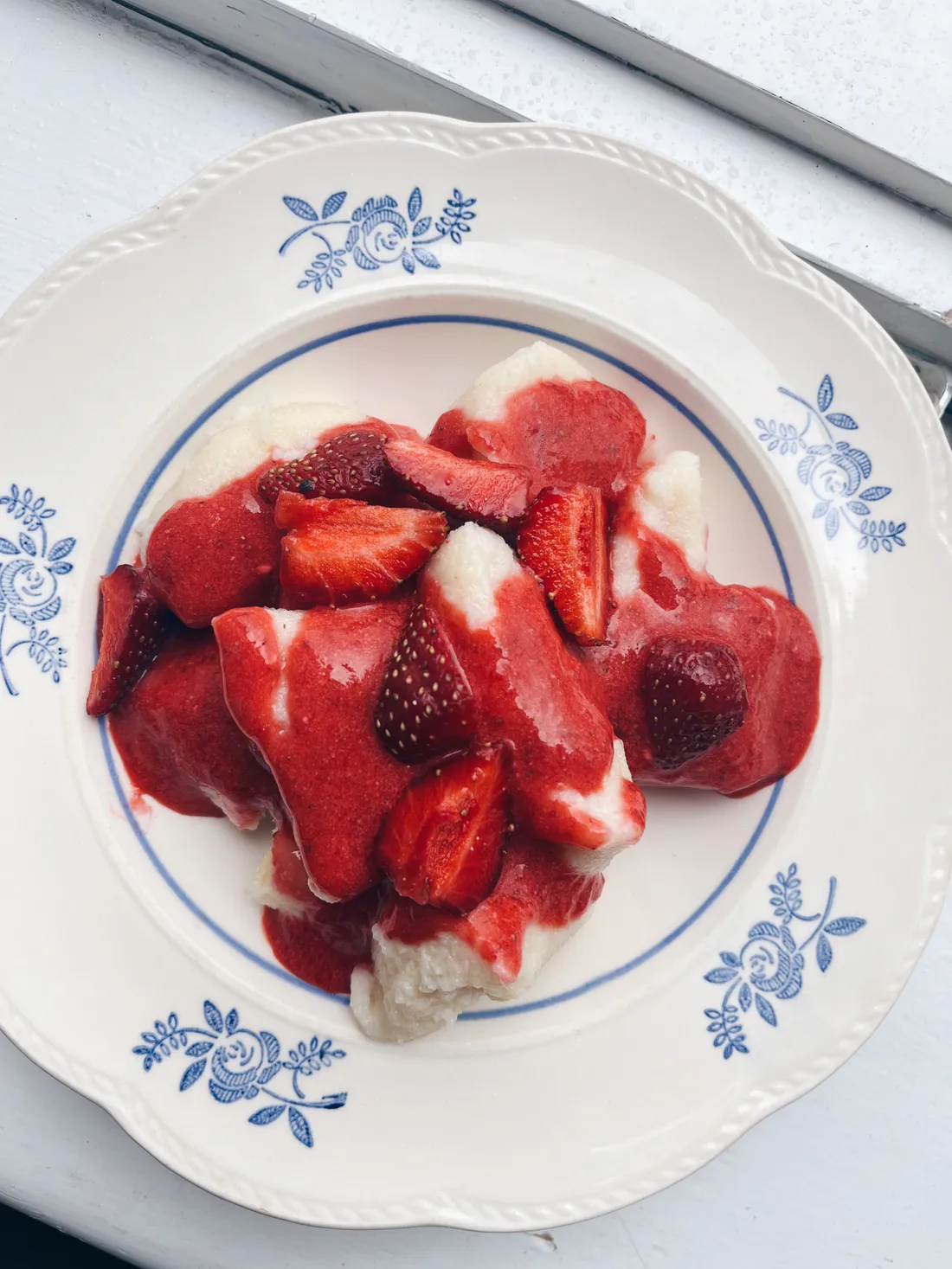 Tvarohové knedlíčky s jahodovou omáčkou podle starého receptu z blogu. Jahody jsem jen rozmixovala se 2 lžíce bílého jogurtu. Děti měly radost a já taky, protože syn je jinak co se mléčných výrobků týče dost vybíravý. A tady snědl tvaroh a ani o tom nevěděl. A aby to bylo rychlejší, nevyvalovala jsem kuličky, jen jsem vyválela válečky a rozkrájela je na kousky.