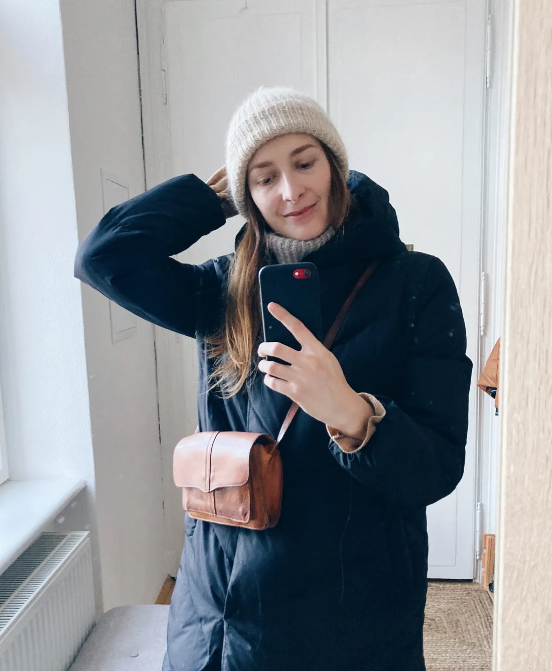 ...péřový kabát, ve kterém je jak ve spacáku. Taky nákrčník, čepici a rukavice.