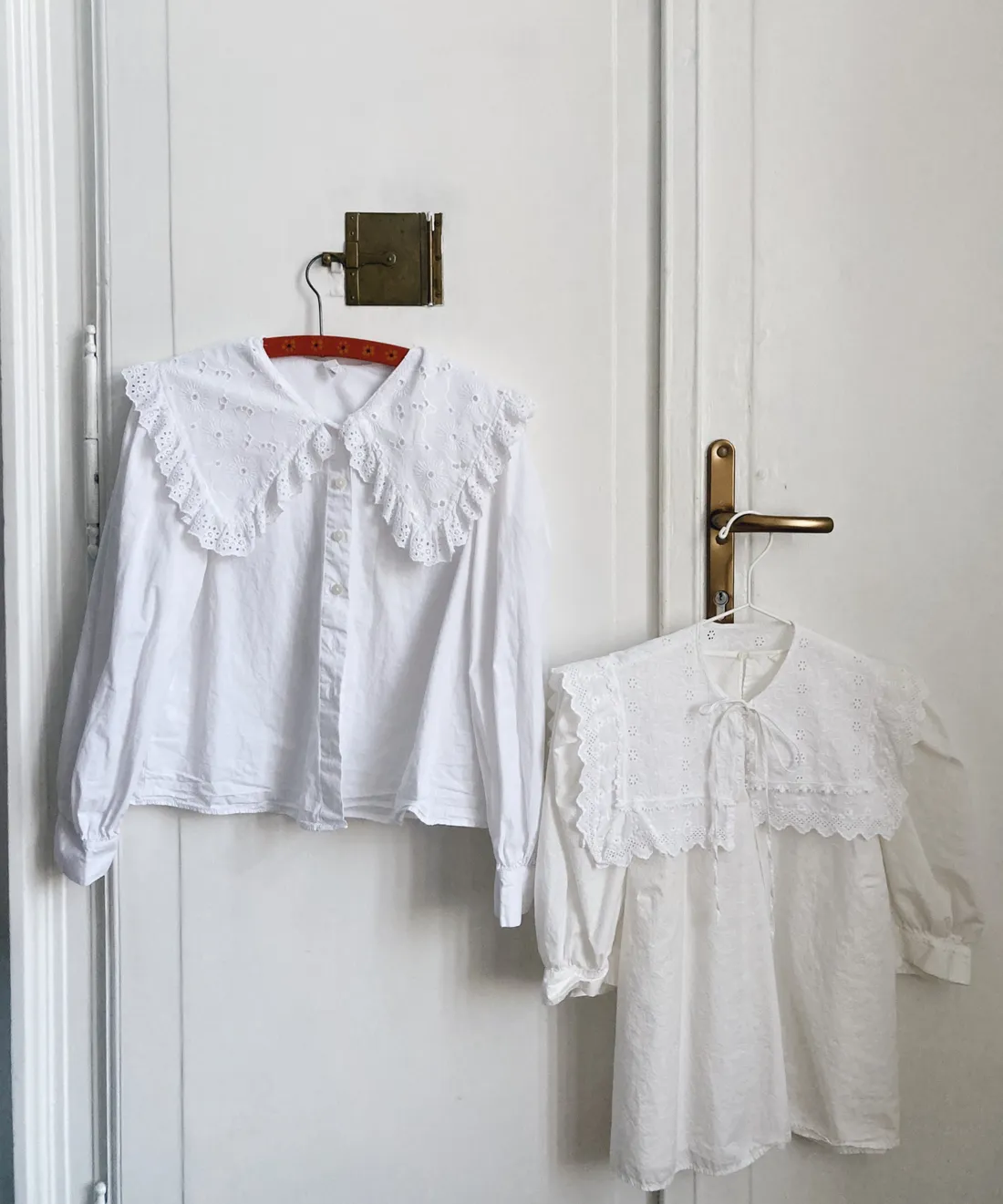 Tady jsou mé nejnovější sekáčové poklady. Bílá košile s vyšívaným límcem a krajkový límeček na košili vpravo.