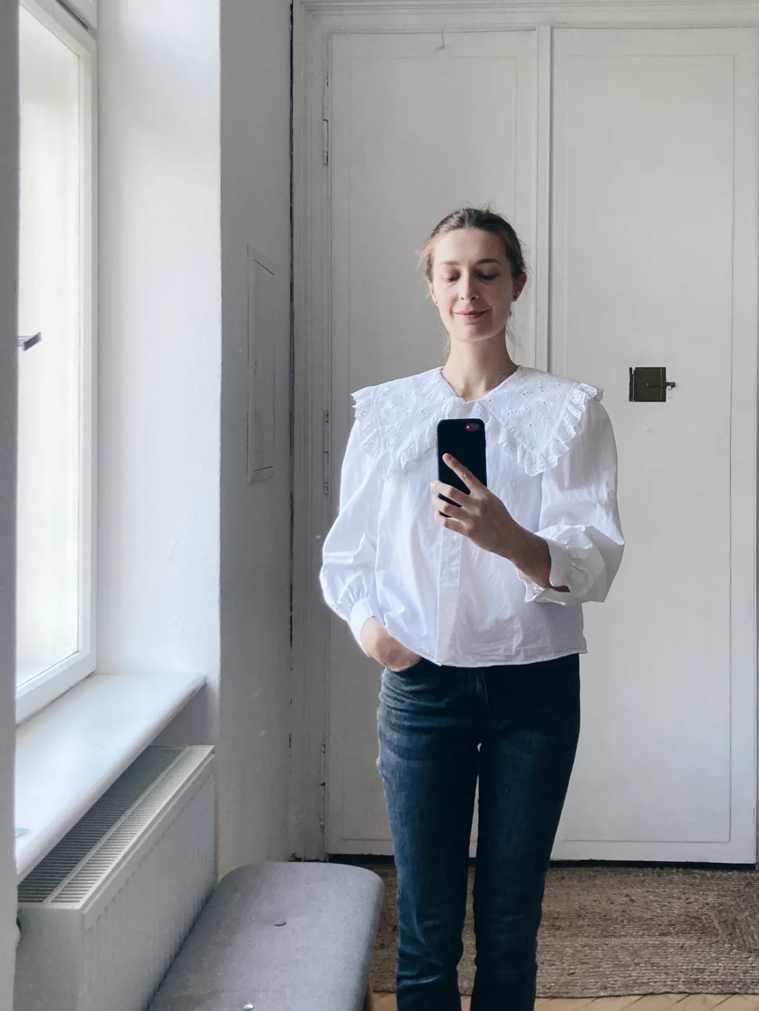 Abych byla úplně upřímná, nejsem si jistá, jestli si tuhle košili nechám, má na mě trochu krátké rukávy a bílá také není úplně moje barva, ale je nádherná! Uvidím, jak se mi zabydlí v šatníku, jinak poputuje na vinted.