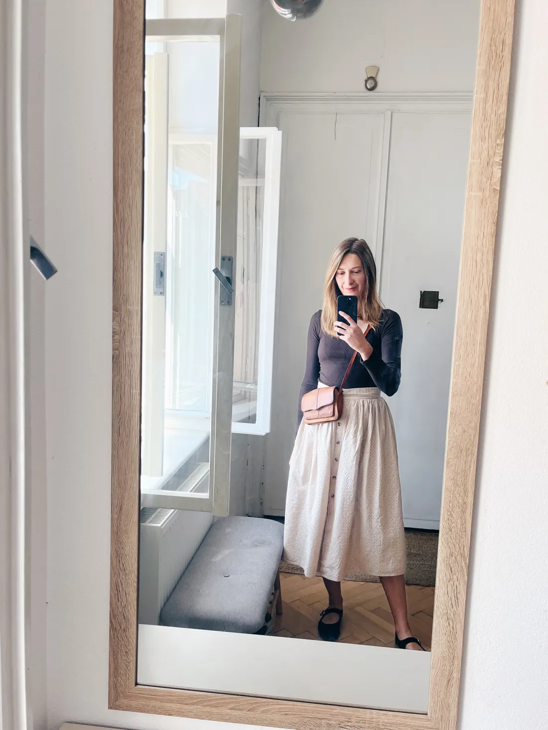 Pak jsem šla s Čotym na ranní procházku. Vzala jsem si jednoduché tričko z Lindexu, madeirovou sukni, koženou kabelku a semišové balerínky. Cítila jsem se docela jako Francouzka 🥐