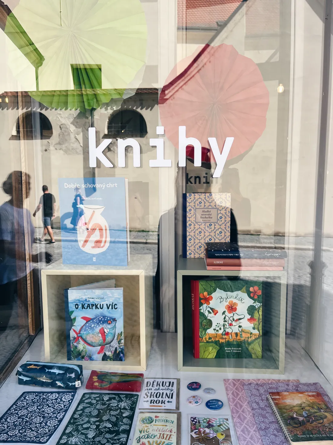S Čotym jsme šli do psího výběhu a zpátky přes město. Kolem butiku Brusinky, kde jsem zahlédla všechny své kuchařky hezky vyrovnané ve výloze.