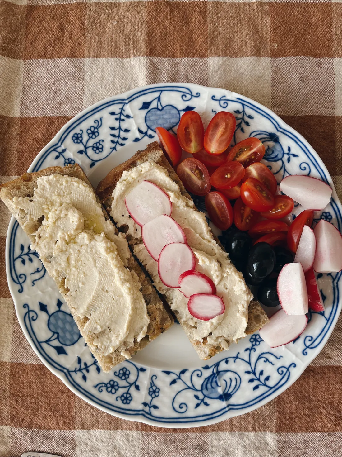 Ke snídani jsem si ho dala s kváskovou fokáčou s bylinkami a k tomu jsem snědla spoustu zeleniny.