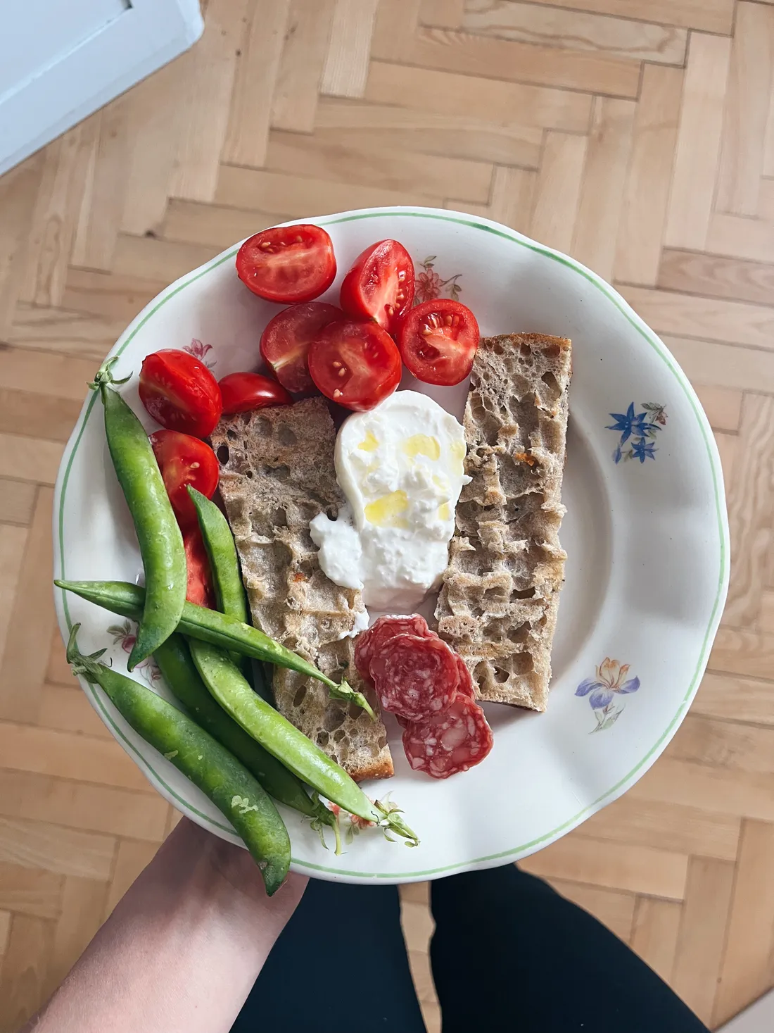 ...a k večeři jsem zase měla fokáču. S burratou, sušeným salámem, rajčaty a hráškem. Nahoru přišla trocha olivového oleje a pár vloček maldonské soli.