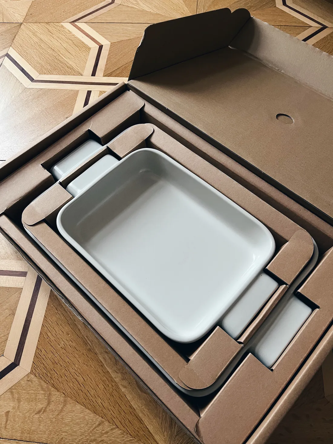 Všechny produkty Fabini, které mi kdy přišly domů, byly velmi pečlivě zabalené. Samotné nádobí je schované do pevné lepenkové krabice, která je ale schovaná ještě v jiné krabici - takže dvojnásobná ochrana, abyste se nemuseli bát rozbitých nebo poškozených kousků. Na fotce už je ta vnitřní krabice.