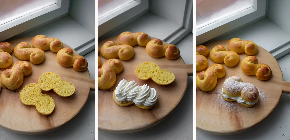 Upečete sice dva plechy lussekatter, ale náplň + šlehačku jsem počítala pouze na 8 kousků. Tolik je podle mě realistické sníst. Pokud chcete naplnit všechno pečivo, zdvojnásobte množství mandelmassy i šlehačky.