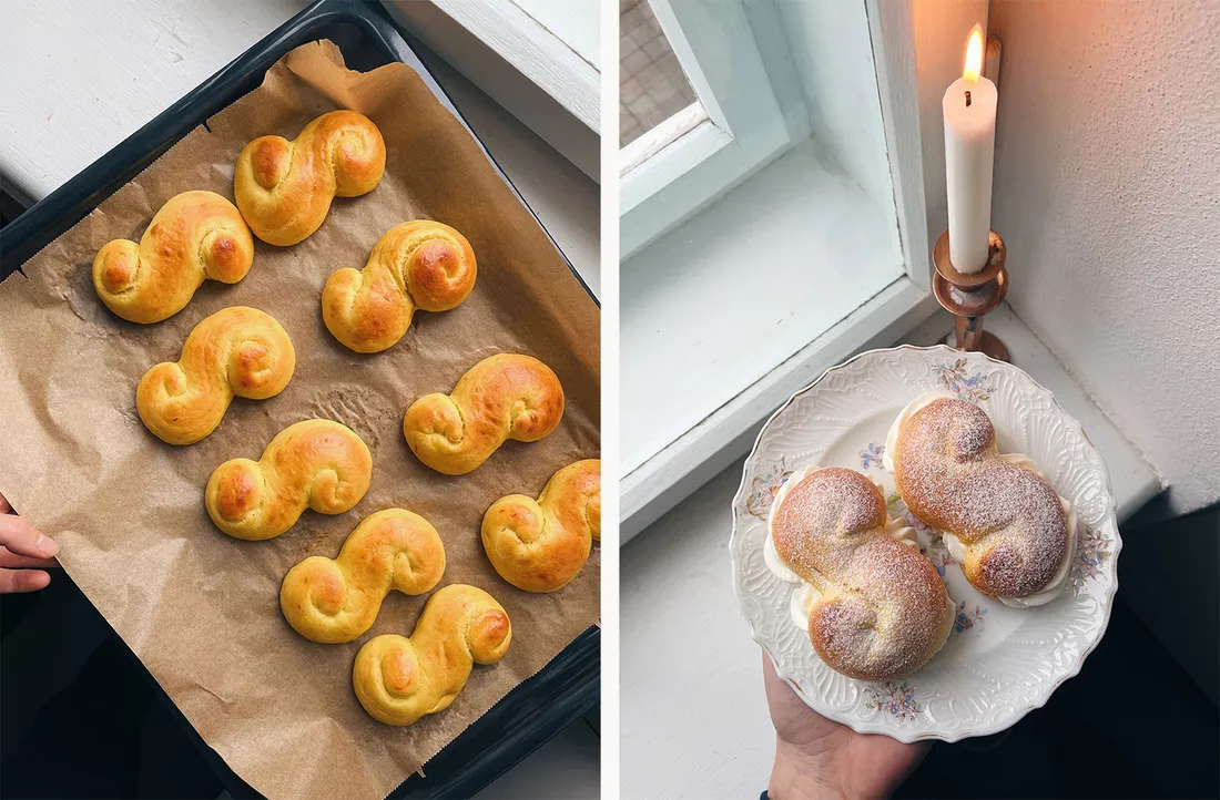 A co vás tedy čeká? Jsou to lussekatter, kynuté šafránové bochánky, které se ve Švédsku pečou 13. prosince na svátek svaté Lucie.