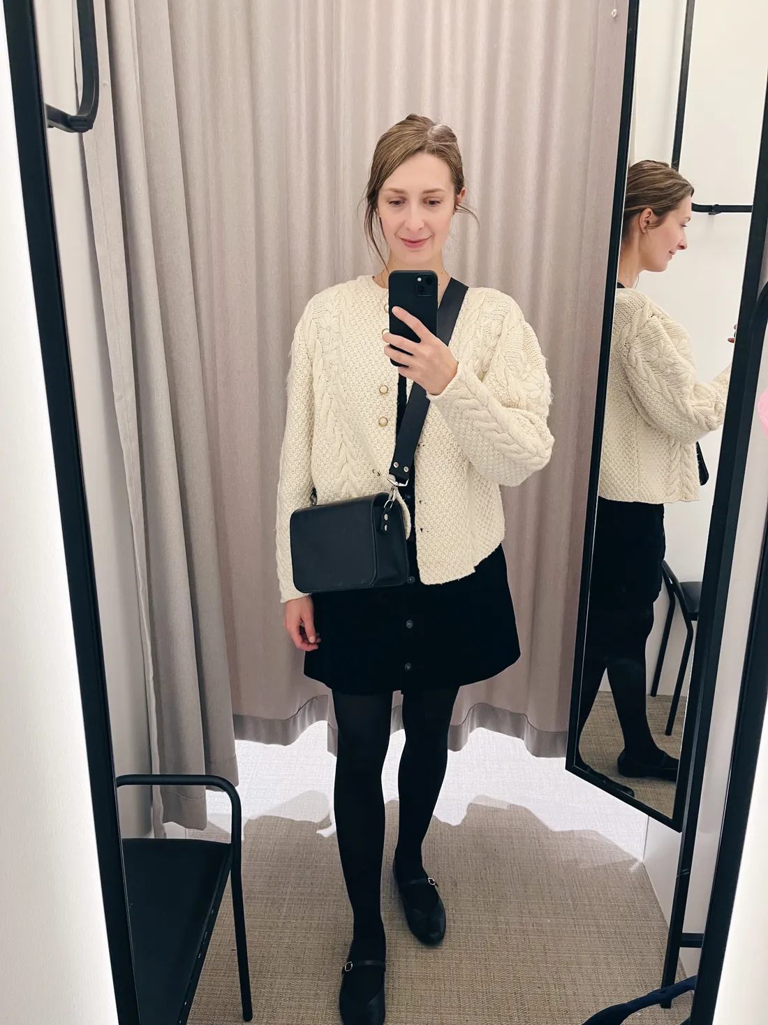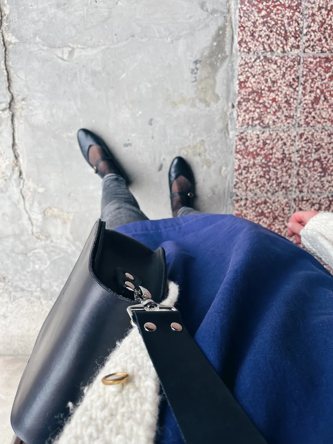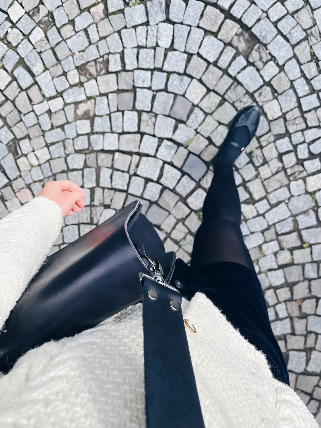 Počasí byl ospíš chladnější, a tak na sobě mám šaty, ve kterých jsem křtila už svou první kuchařku FIKA (to se psal rok 2018!) a pod nimi rifle. A taky teplý vintage svetr, minimalistickou kabelku Eggo a balerínky. A teď hurá na autobus do Brna!