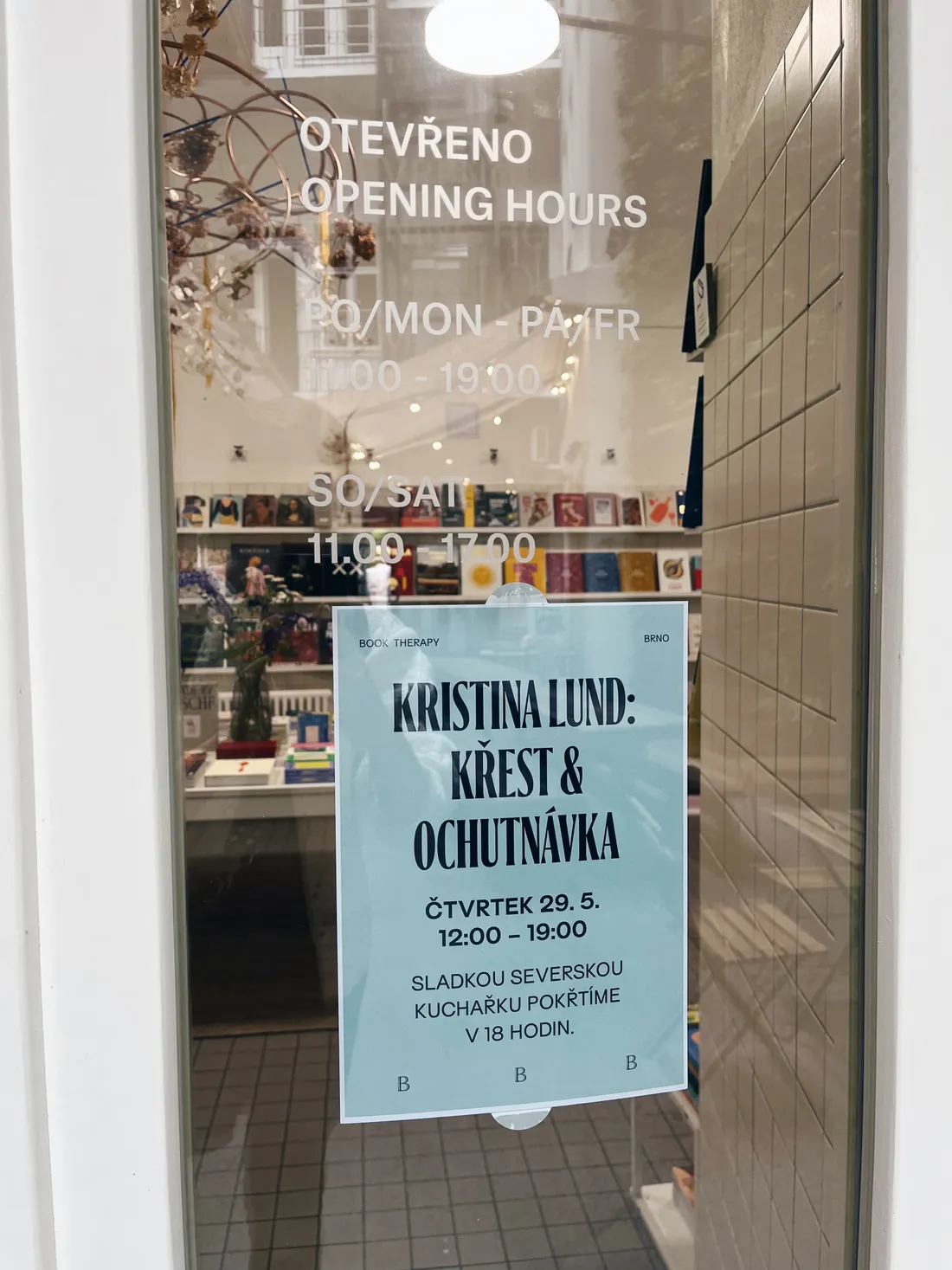 A tady, v Book Therapy ve vnitrobloku na Zelném trhu 10, se konal křest mojí kuchařky.