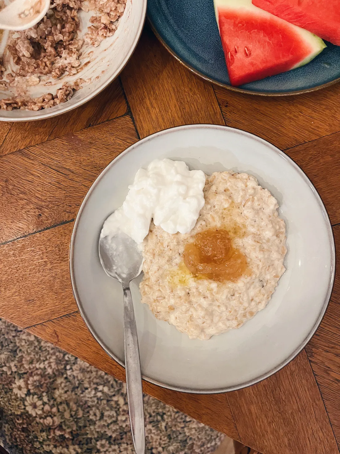 Ke snídani jsme měli ovesnou kaši s kokosovým jogurtem a citrusovou marmeládou. Dobrota.