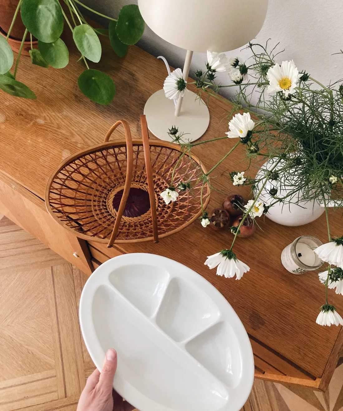 Úlovky z druhé ruky – proutěný košík a těžký keramický servírovací podnos. Z takových pokladů mám vždycky radost.