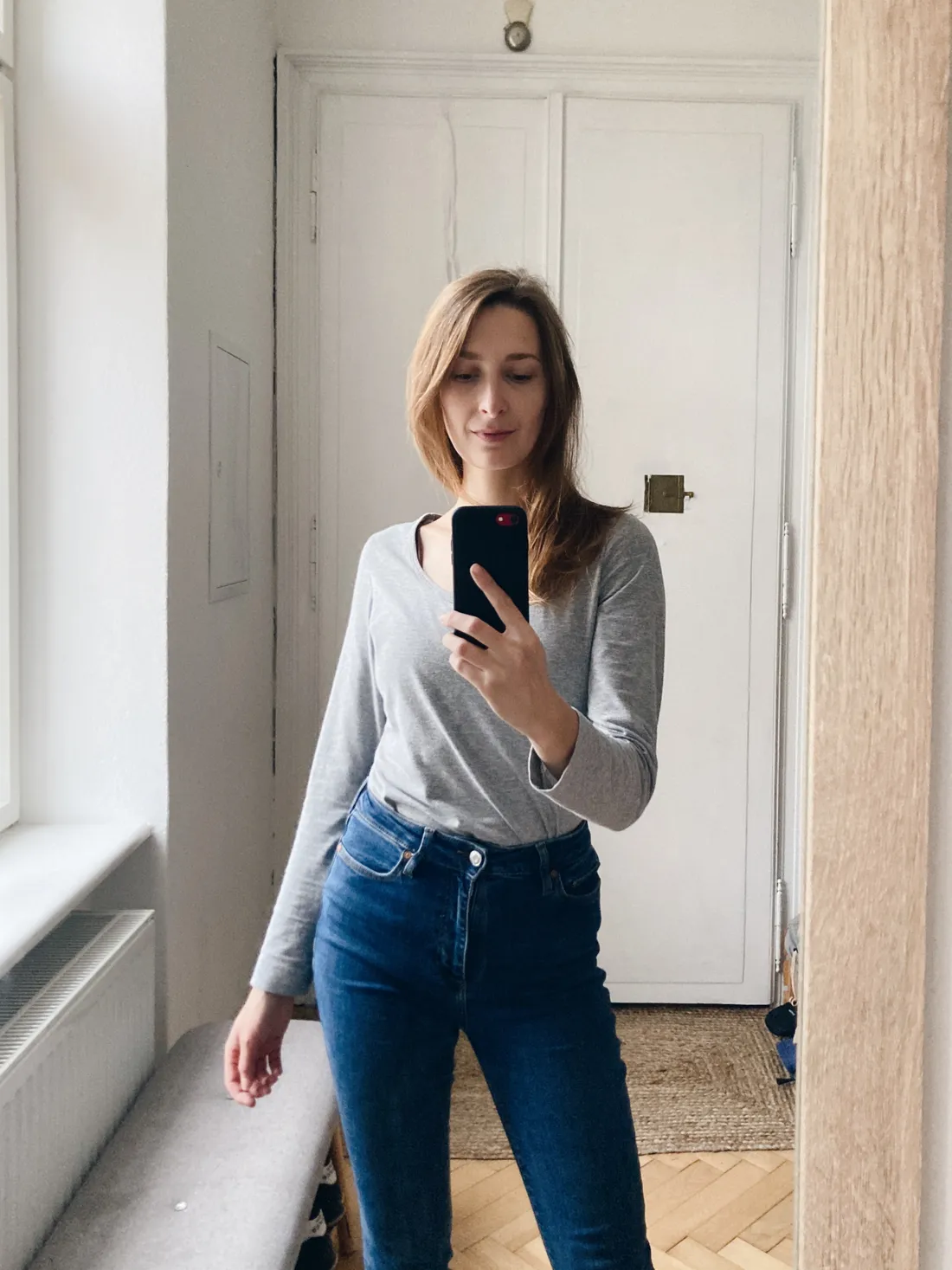 Dneska ráno se mi sice trochu hůř vstávalo, ale stálo to za to. Odvedla jsem děti do školky a na sobě jsem měla jednu ze svých nejčastějších kombinací. Jednoduché tričko (podobné najdete tedy), letité rifle a hebounký kašmírový svetr ze sekáče.