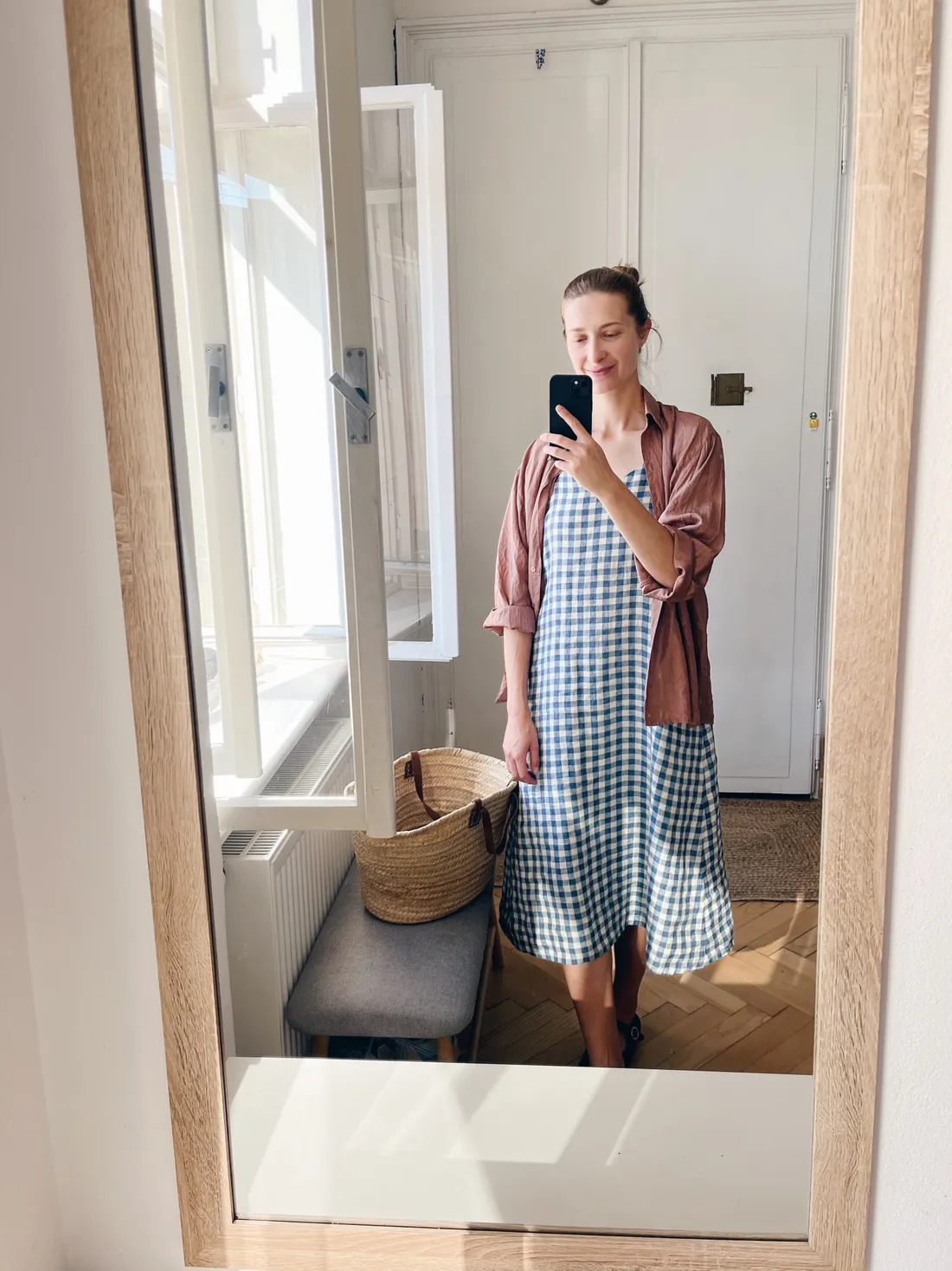 Kostičkované šaty Joli Joli a hedvábná košile. Často je nosím jako takovou lehkou horní vrstvu.