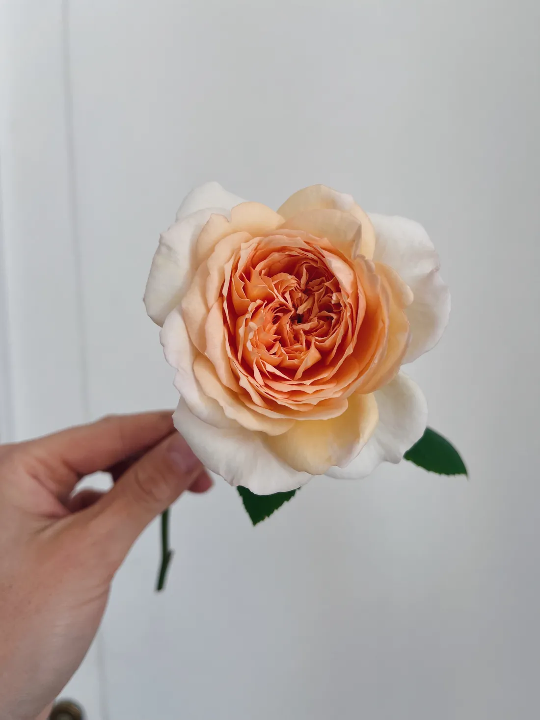 Nemohla jsem odolat a utrhla jsem si jeden květ Bathsheby domů do vázičky. Květ je na začátku sytě meruňkový a později bledne do světlejších tónů.