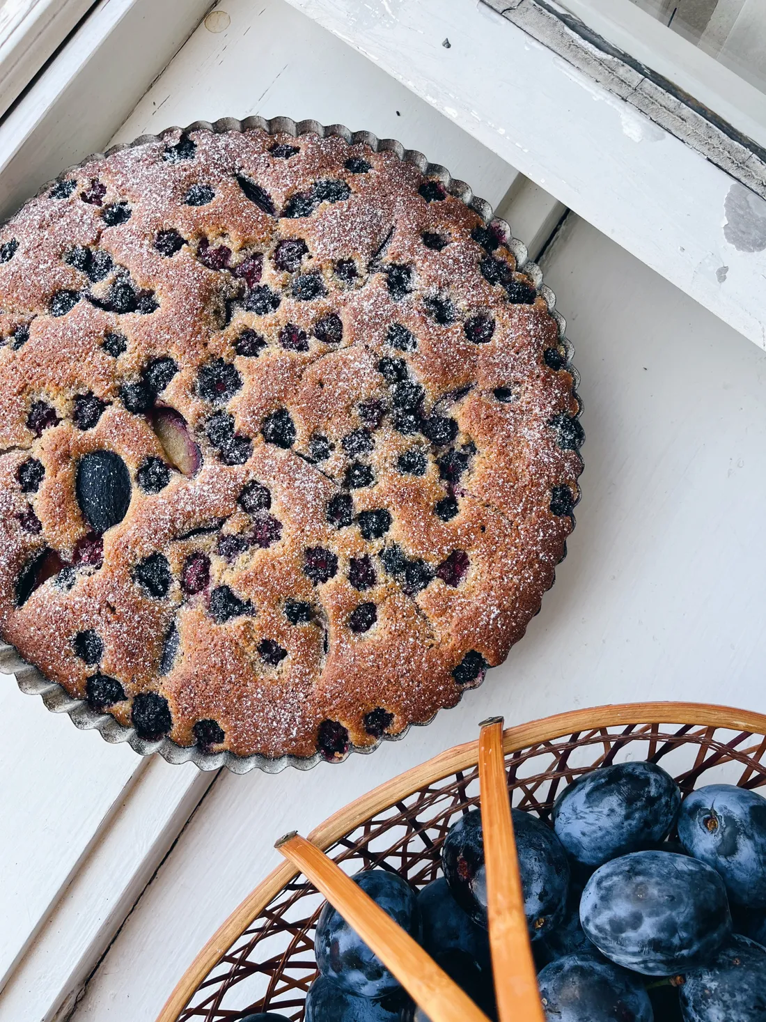 Koláč, který na povrchu až moc zezlátnul, protože moje trouba víceméně dosluhuje a nedá se v ní spolehlivě nastavit teplota. Ale byl výborný i tak. Je to recept ze Sladké severské kuchařky, norský koláč se švestkami, my do něj ještě přisypali hrst ostružin z procházky.