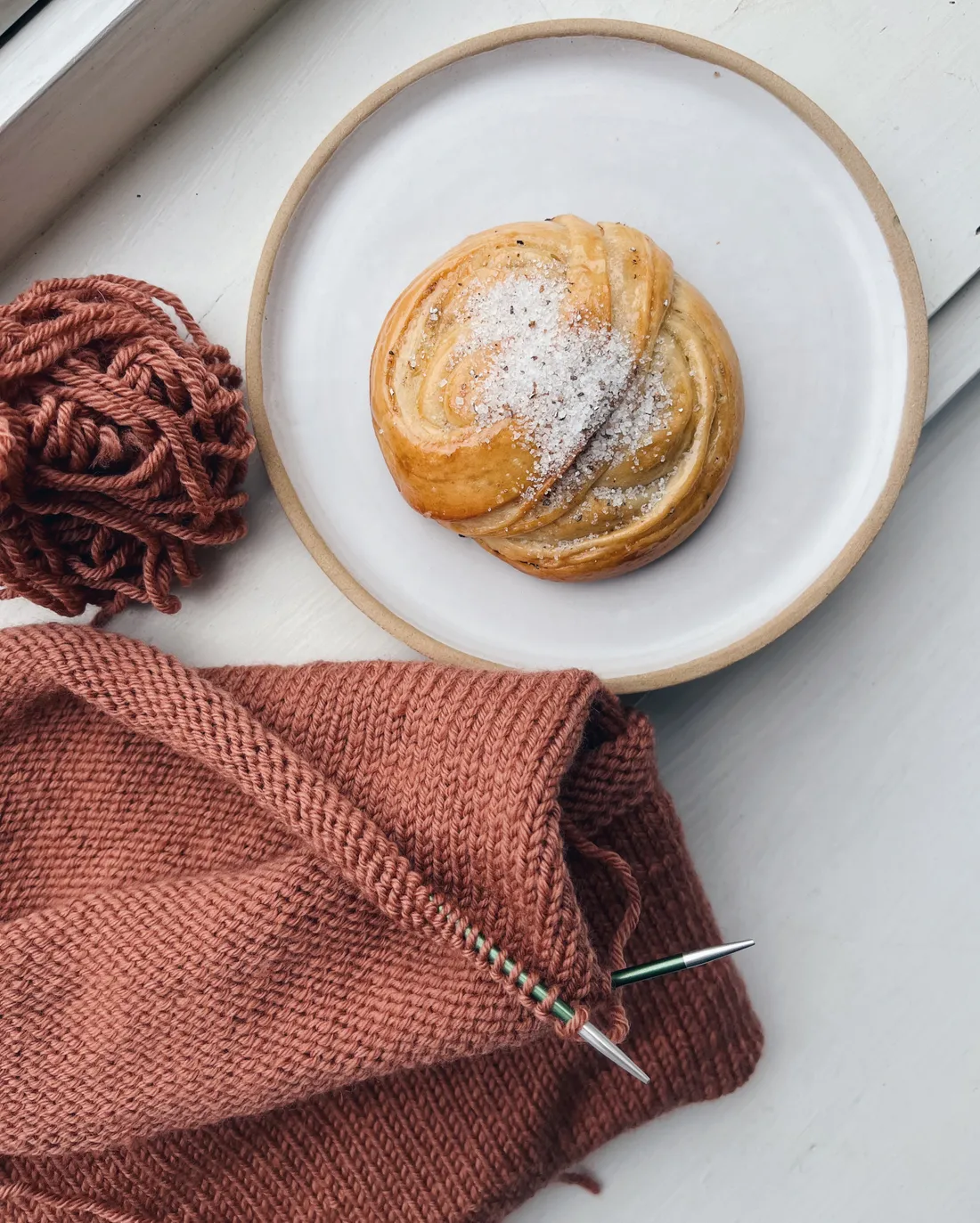 Nakonec trocha hygge - pletení a kardamomový šnek. Moje trouba se rozhodla už vůbec nepéct, naštěstí mám skvělou paní sousedku, která mě šneky nechala upéct v té své. Já teď musím vybrat novou.