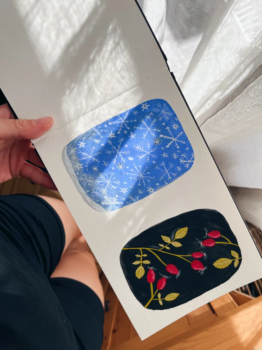 A zatímco venku je vedro k zalknutí, já doma pracuju na letošních vánočních pohledech. Tady jsem zkoušela sněhové vločky.