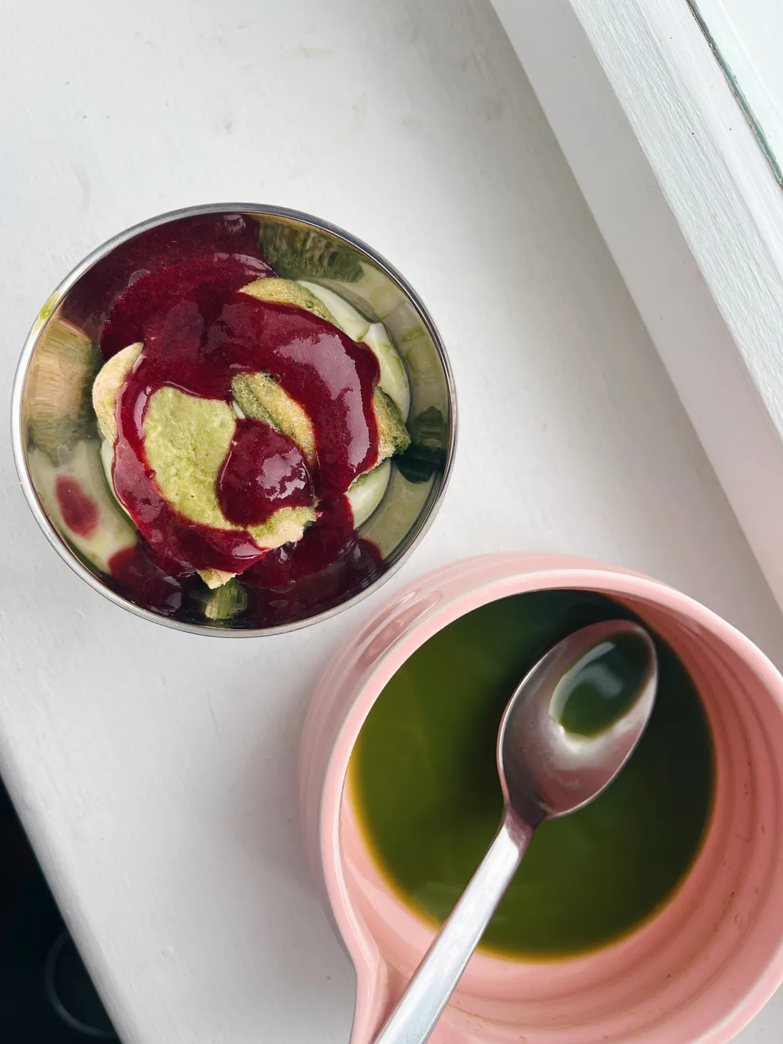 Matcha tiramisu s jahodovým pyré, recept najdete u mě na Instagramu.